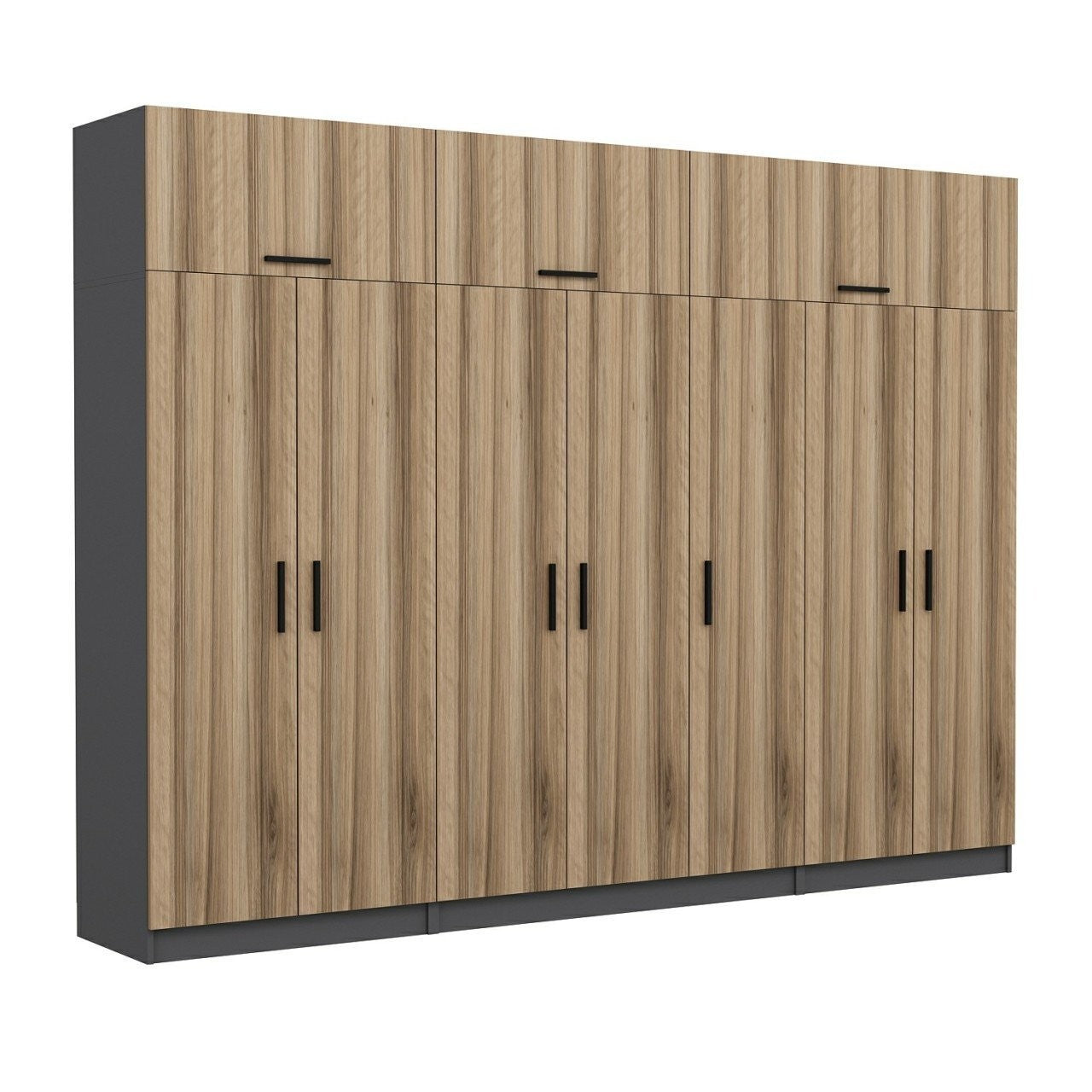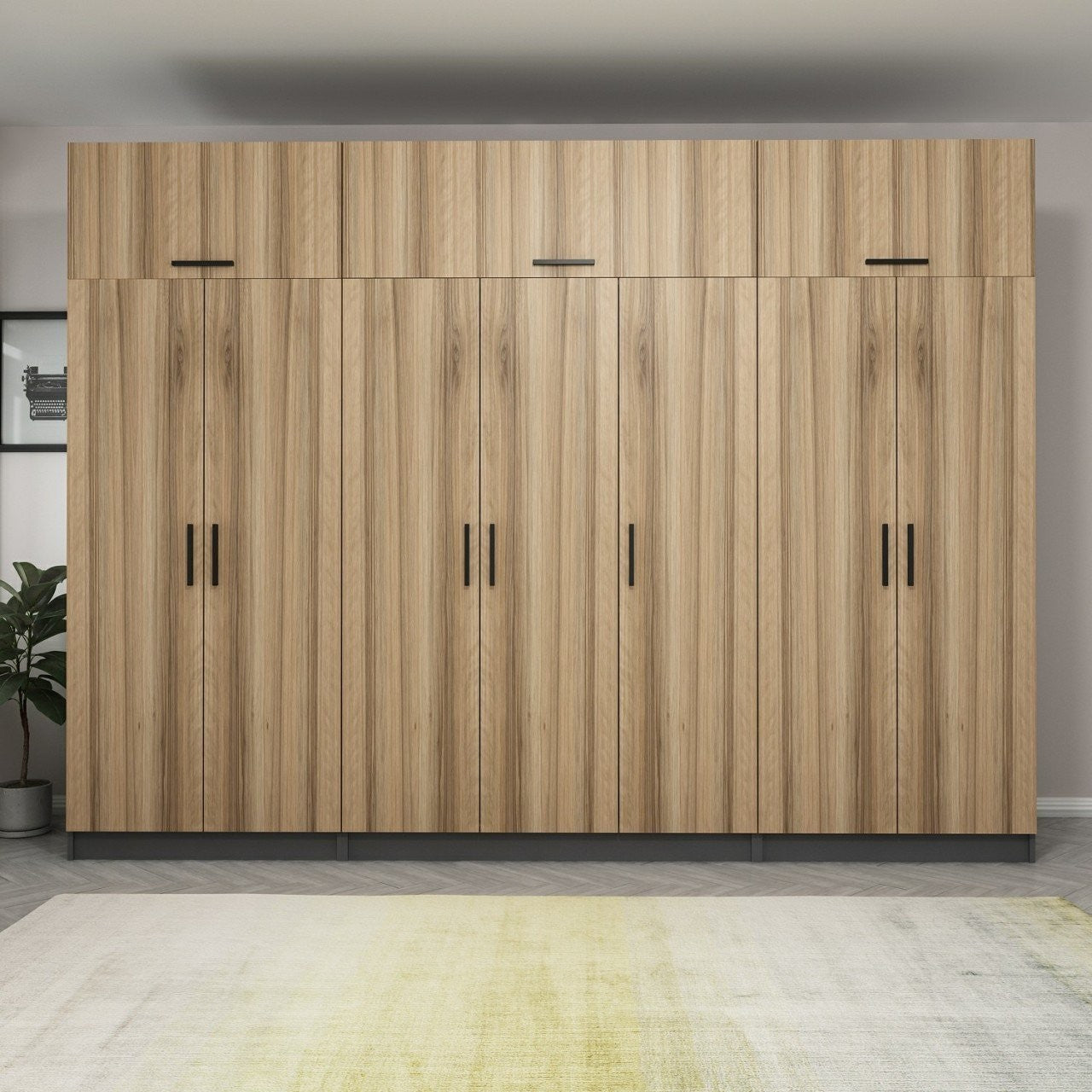 Com uma largura de 315 cm, altura de 255 cm e profundidade de 52 cm, este guarda -roupa oferece amplo espaço de armazenamento para todas as suas roupas e acessórios. As numerosas prateleiras oferecem muito espaço para seus pertences, mantendo tudo elegante e arrumado.
