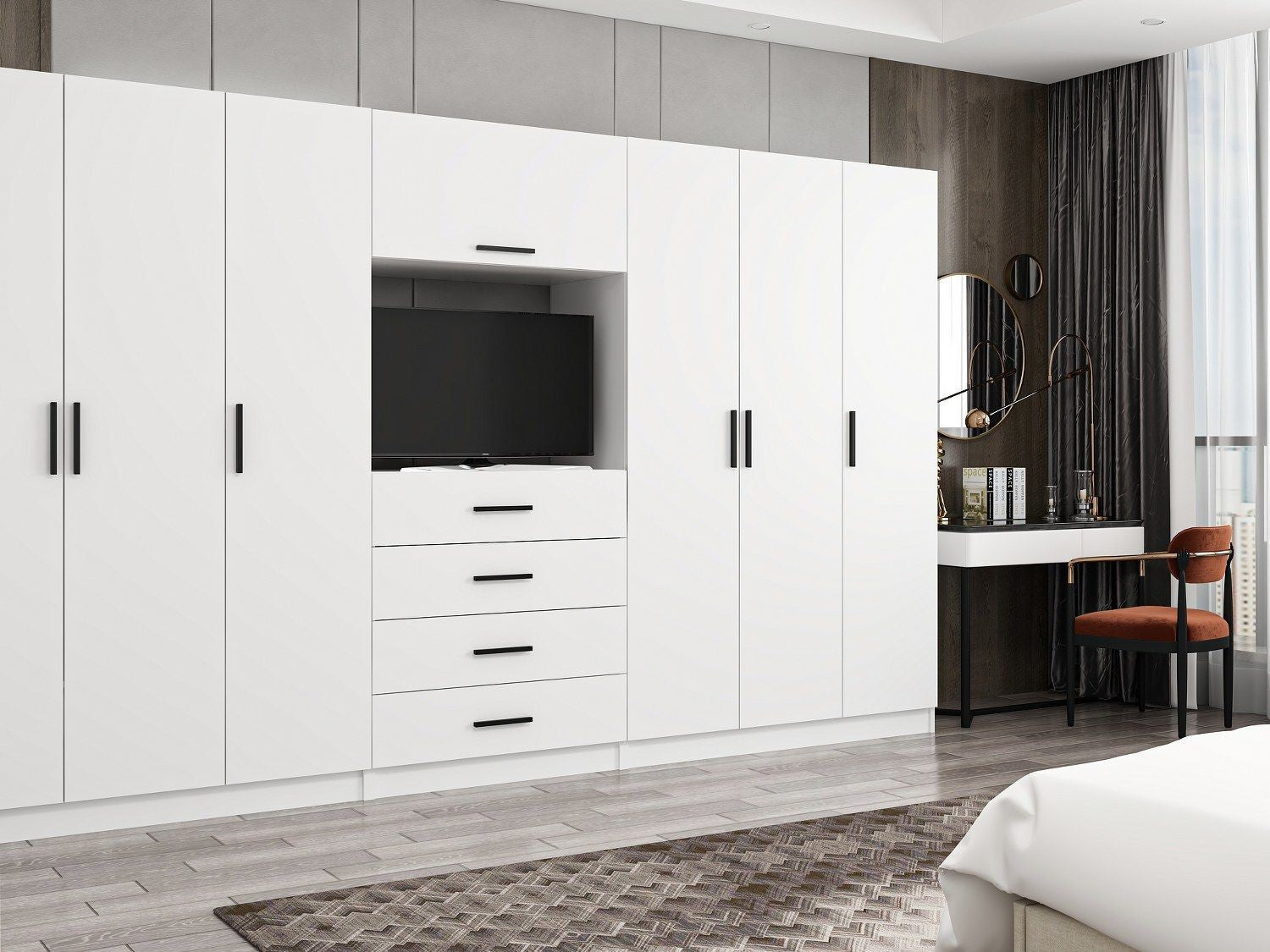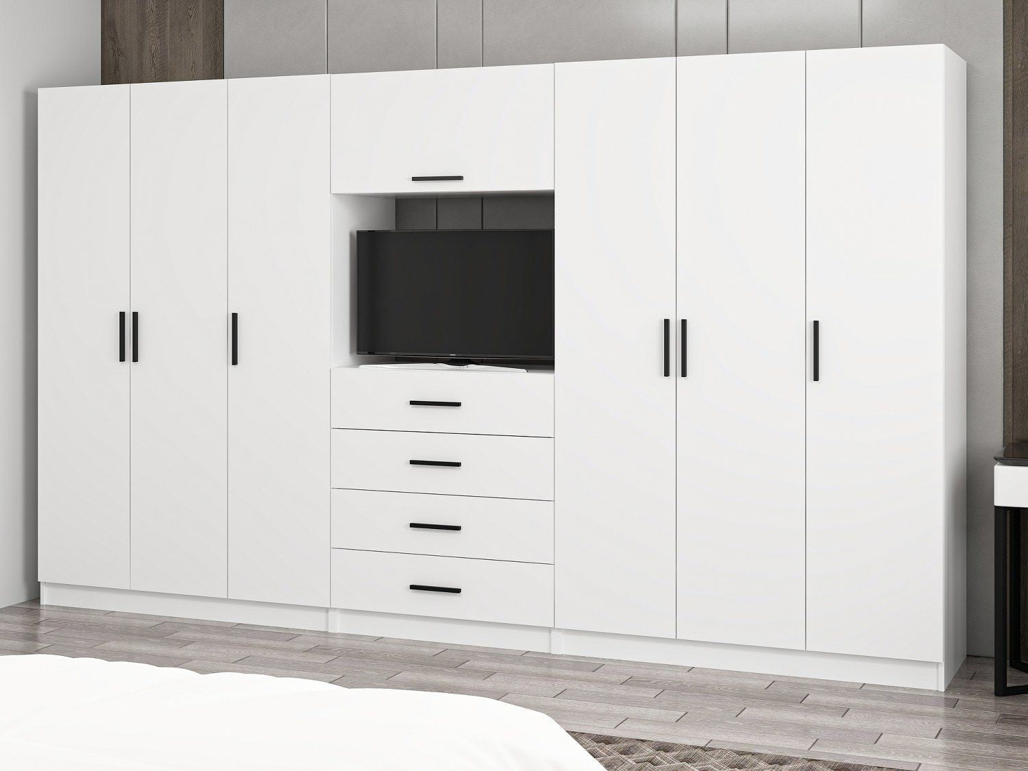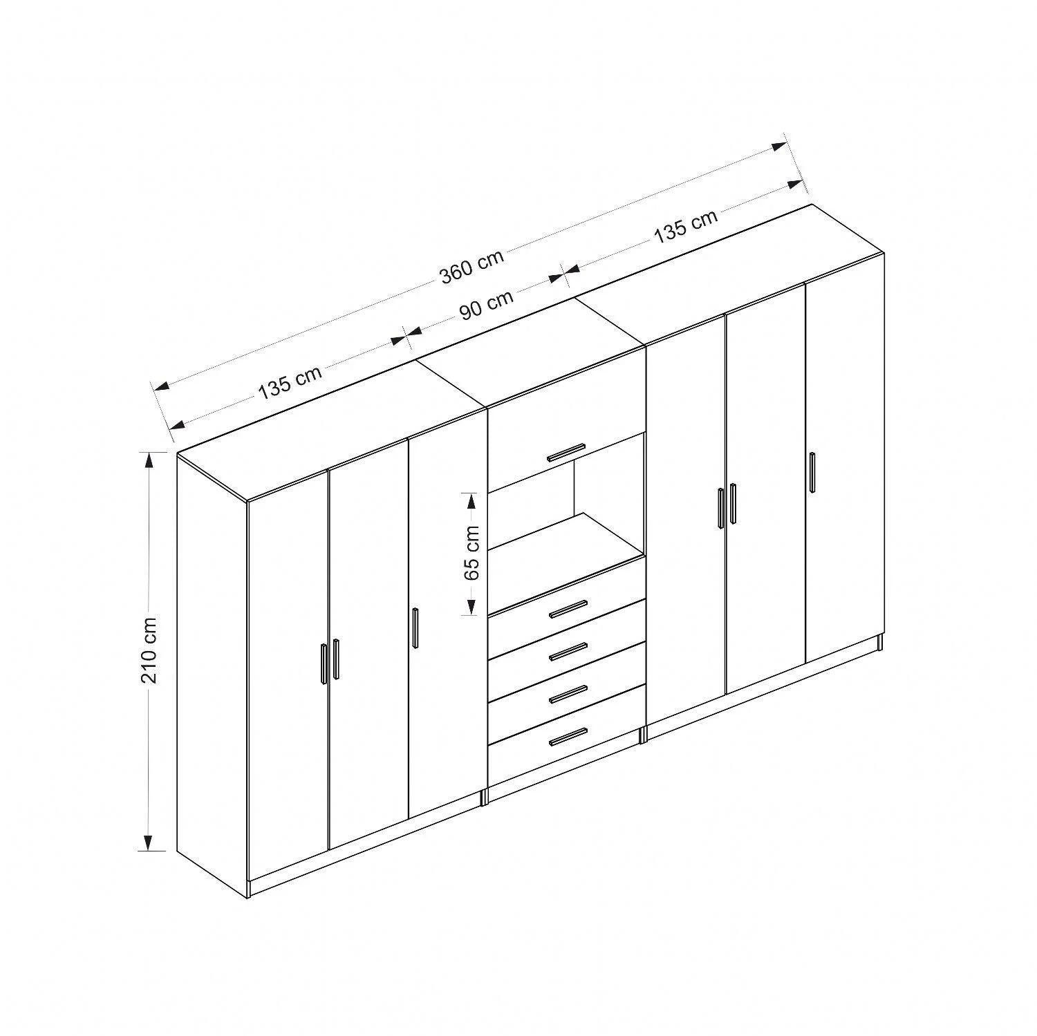 Com uma largura de 360 cm, altura de 210 cm e profundidade de 52 cm, este guarda -roupa oferece amplo espaço para todas as suas roupas, sapatos e acessórios. As inúmeras prateleiras oferecem muito espaço para armazenamento, enquanto a cor branca elegante adiciona um toque de elegância a qualquer sala.