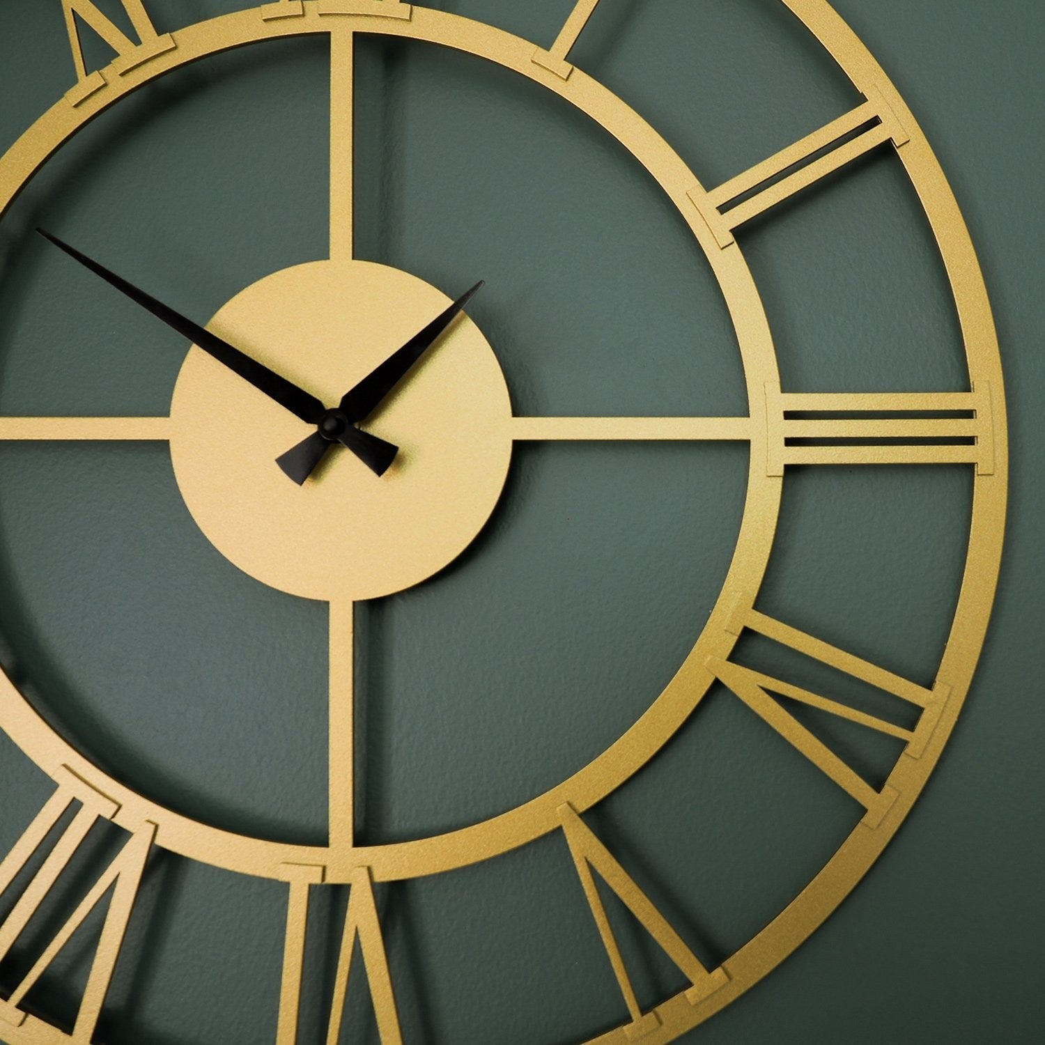 Este magnífico relógio de parede metálico em dourado combina o charme clássico dos algarismos romanos com um design contemporâneo sofisticado. Com as suas dimensões generosas de 49x49 cm, torna-se o ponto focal perfeito para qualquer divisão da sua casa.