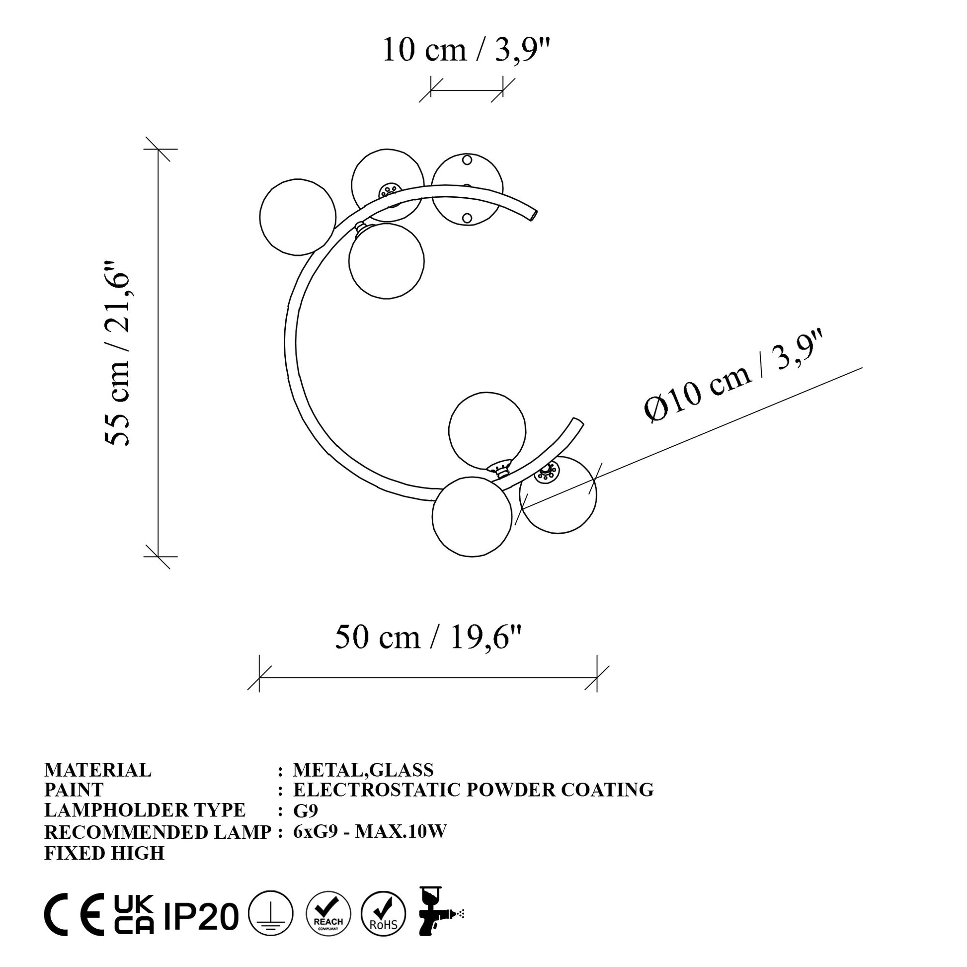 Com um tamanho de 50 x 30 x 55 cm e uma placa de base de ø10 h:2 cm, este candeeiro de parede é fácil de instalar e pode ser montado em qualquer parede da sua casa. O tipo de casquilho é 6 x g 9 max 10 w, e o candeeiro funciona a 220-240 v. Tenha em atenção que a lâmpada não está incluída no candeeiro.