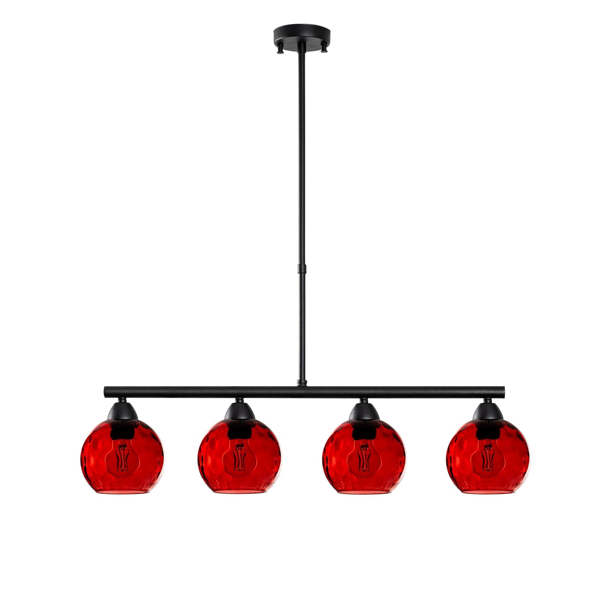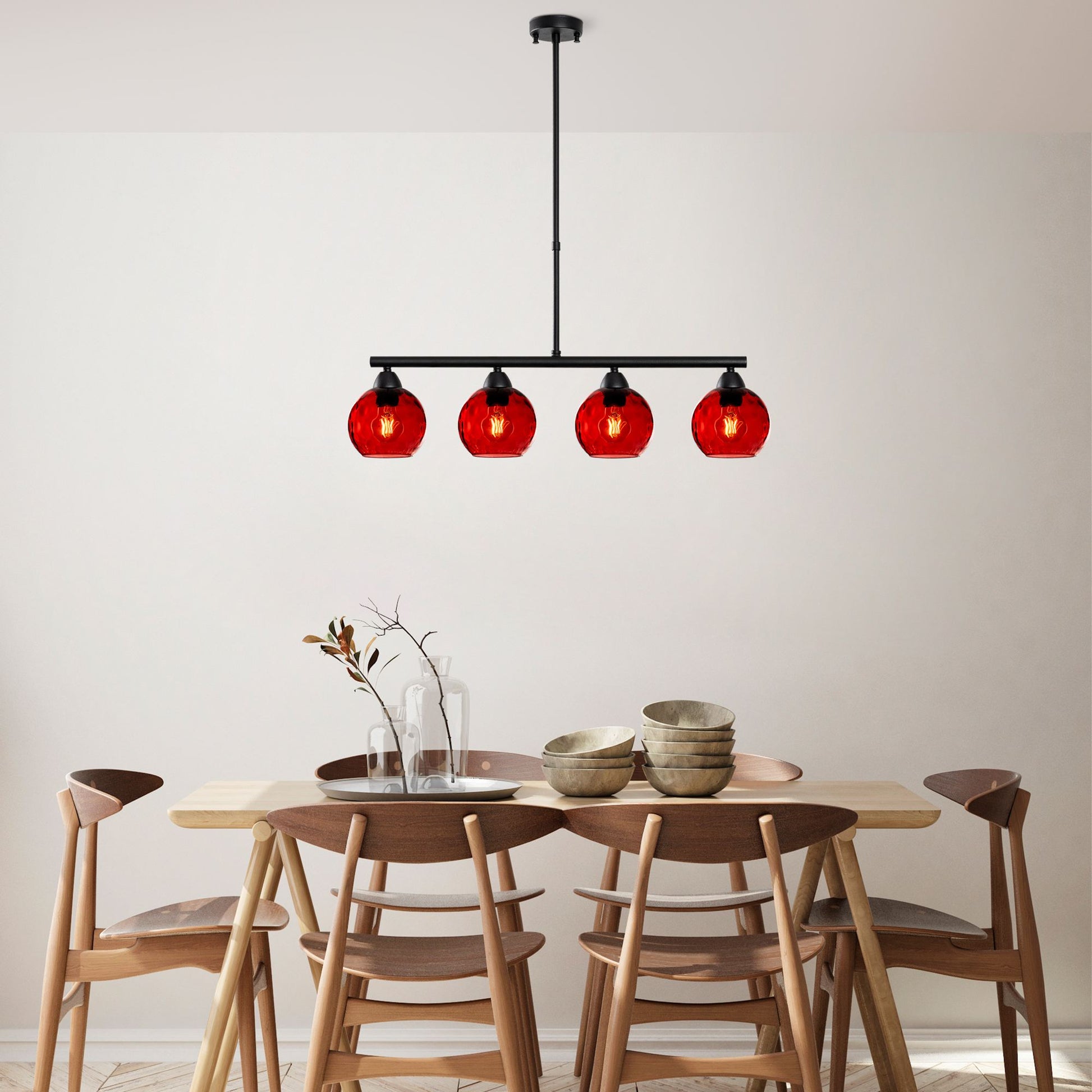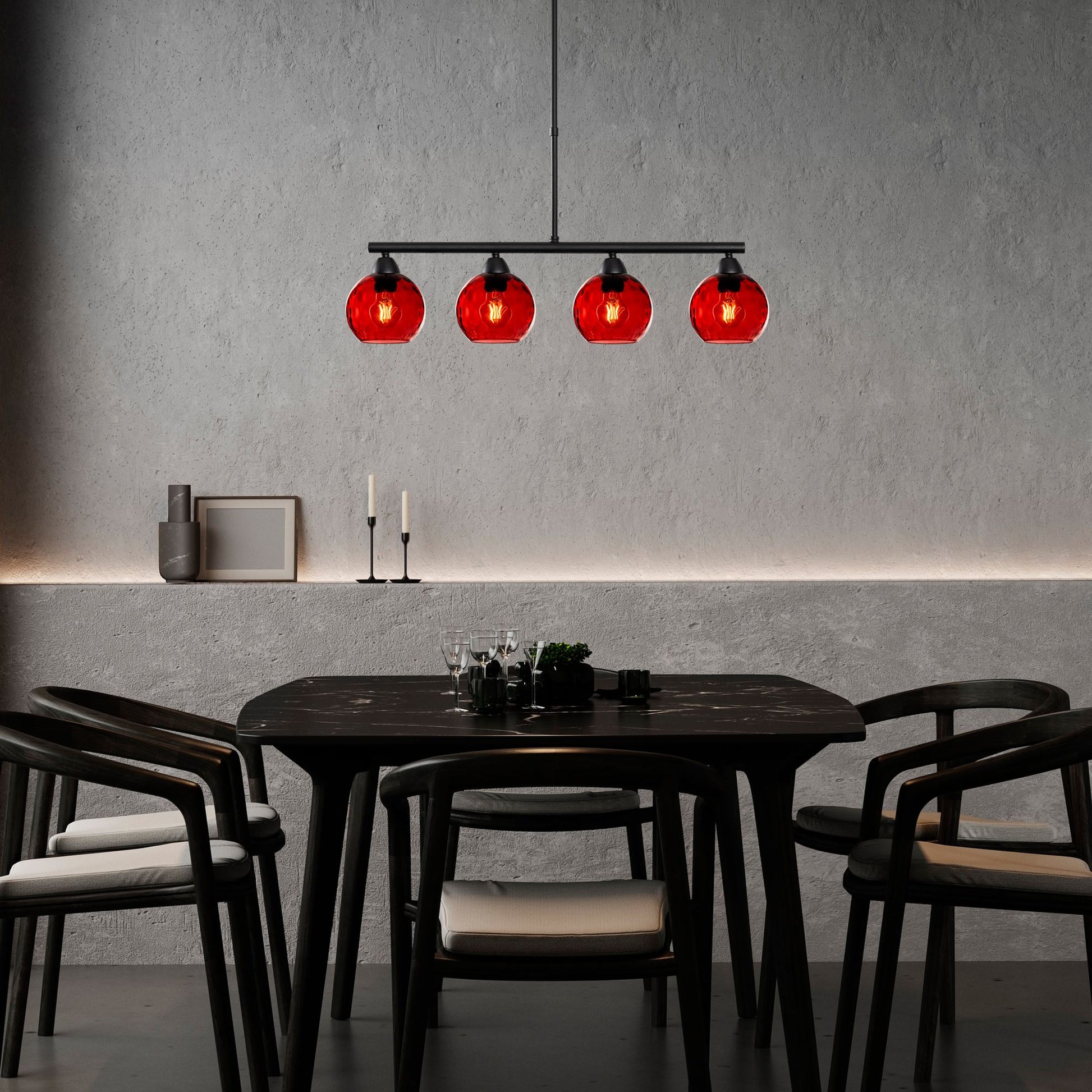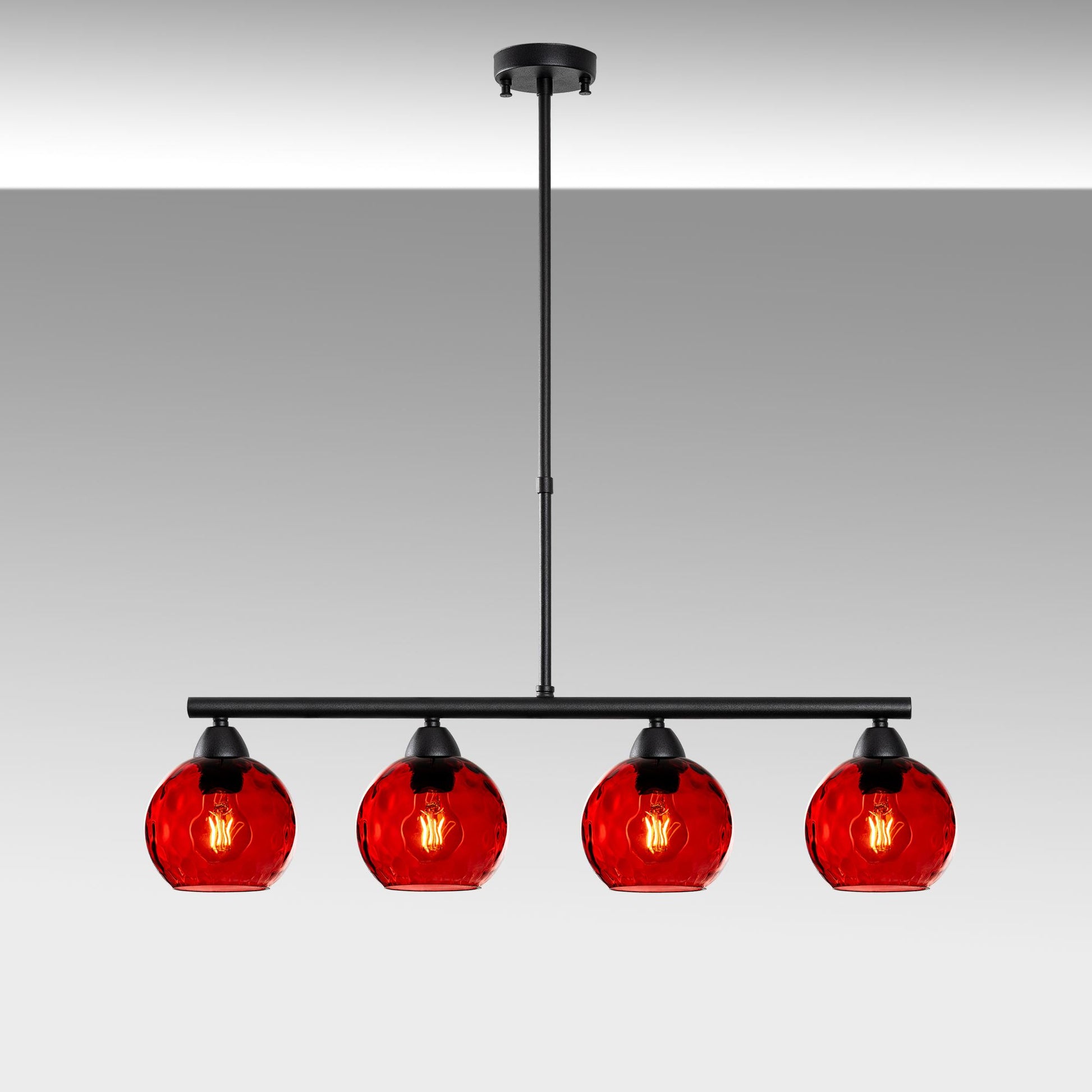 O corpo metálico elegante do lustre é lindamente complementado pela cúpula de vidro, criando um visual moderno e estiloso que realçará a decoração da sua casa. As cores ousadas de vermelho e preto adicionam um toque de personalidade a qualquer ambiente, tornando-se um ponto focal que impressionará sua família e amigos.