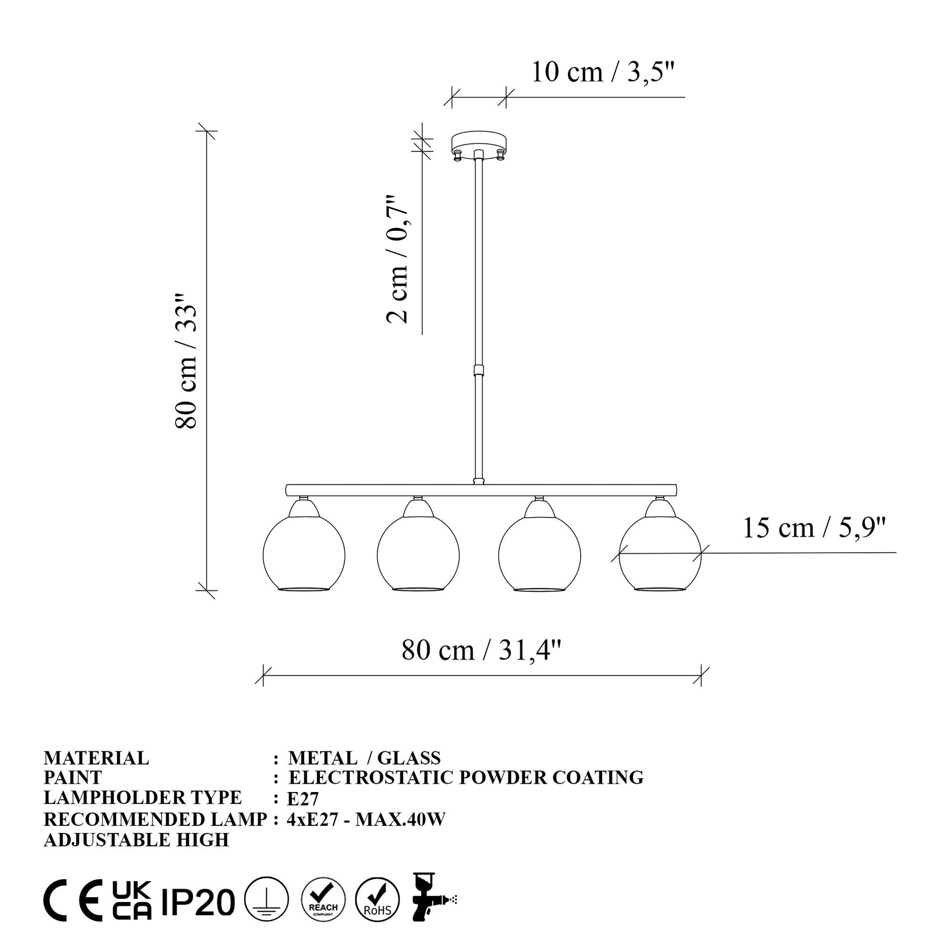 Com um tamanho de 80 x 15 x 80 cm, este lustre é o tamanho perfeito para pendurar sobre uma mesa de jantar, em uma sala de estar ou até mesmo em um quarto. O brilho suave das quatro lâmpadas E27 (não incluídas) criará uma atmosfera acolhedora, perfeita para relaxar ou entreter.
