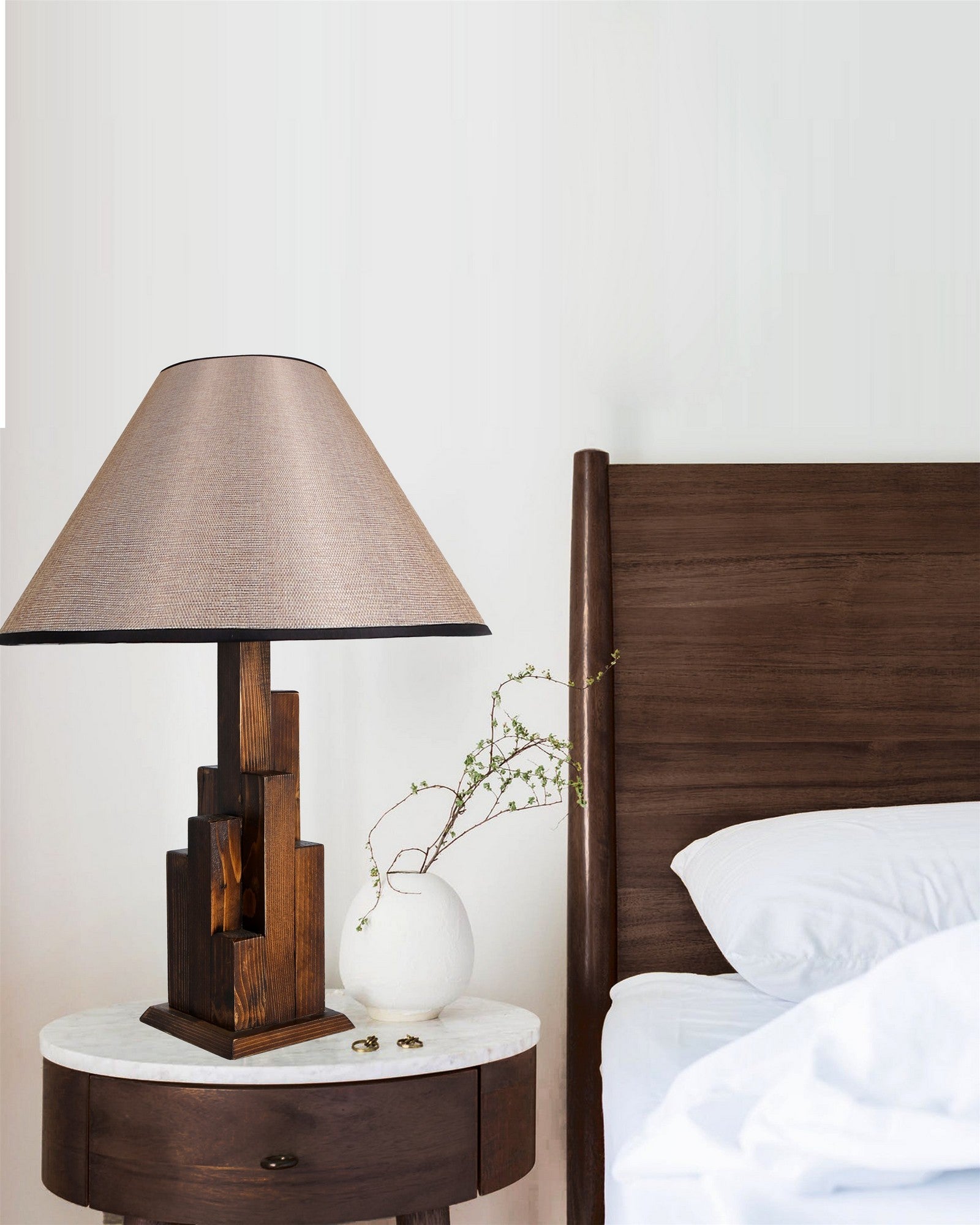 - Corpo de madeira com abajur de tecido