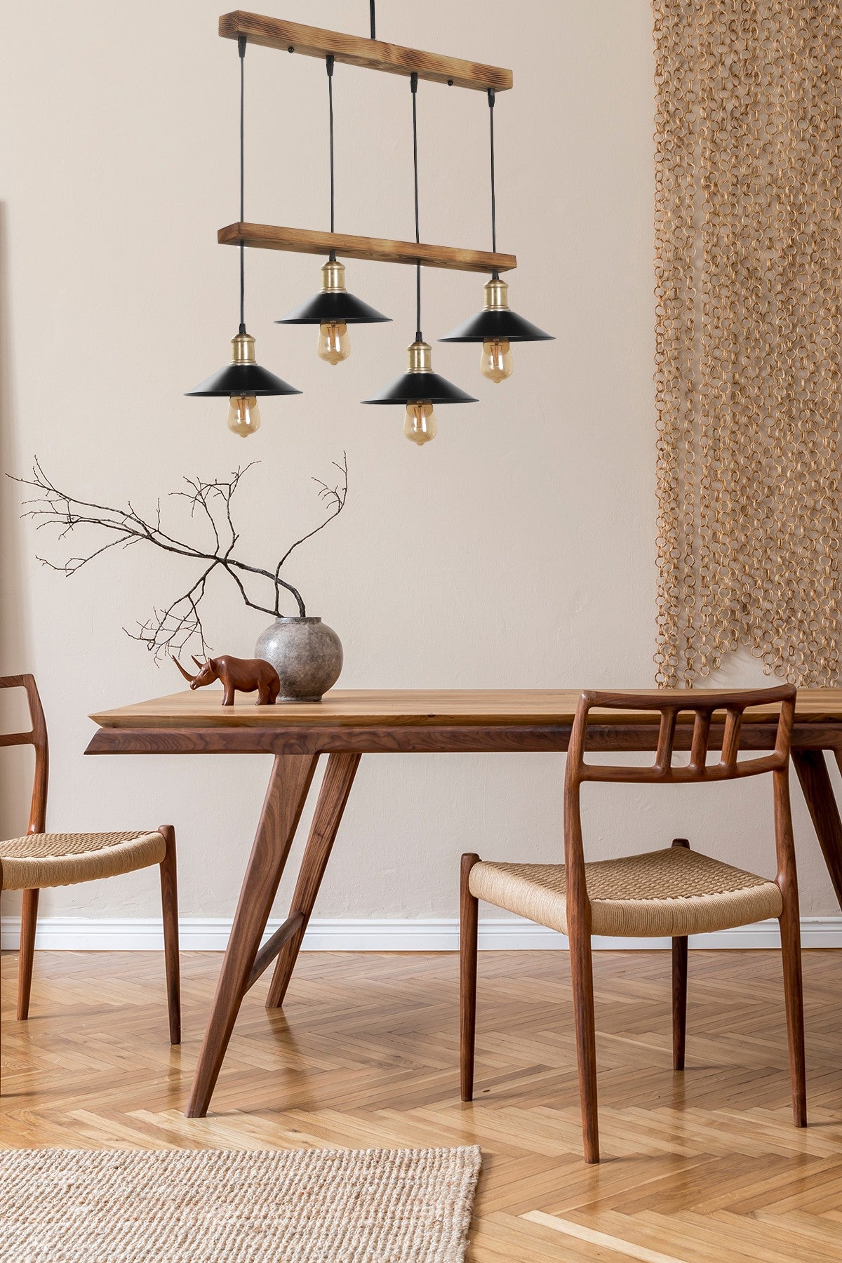 O corpo de madeira deste lustre exala um charme rústico, enquanto a tampa de metal adiciona um toque de estilo industrial. A combinação perfeita de materiais cria um contraste visual impressionante que imediatamente chama a atenção e se torna o ponto focal de qualquer ambiente.