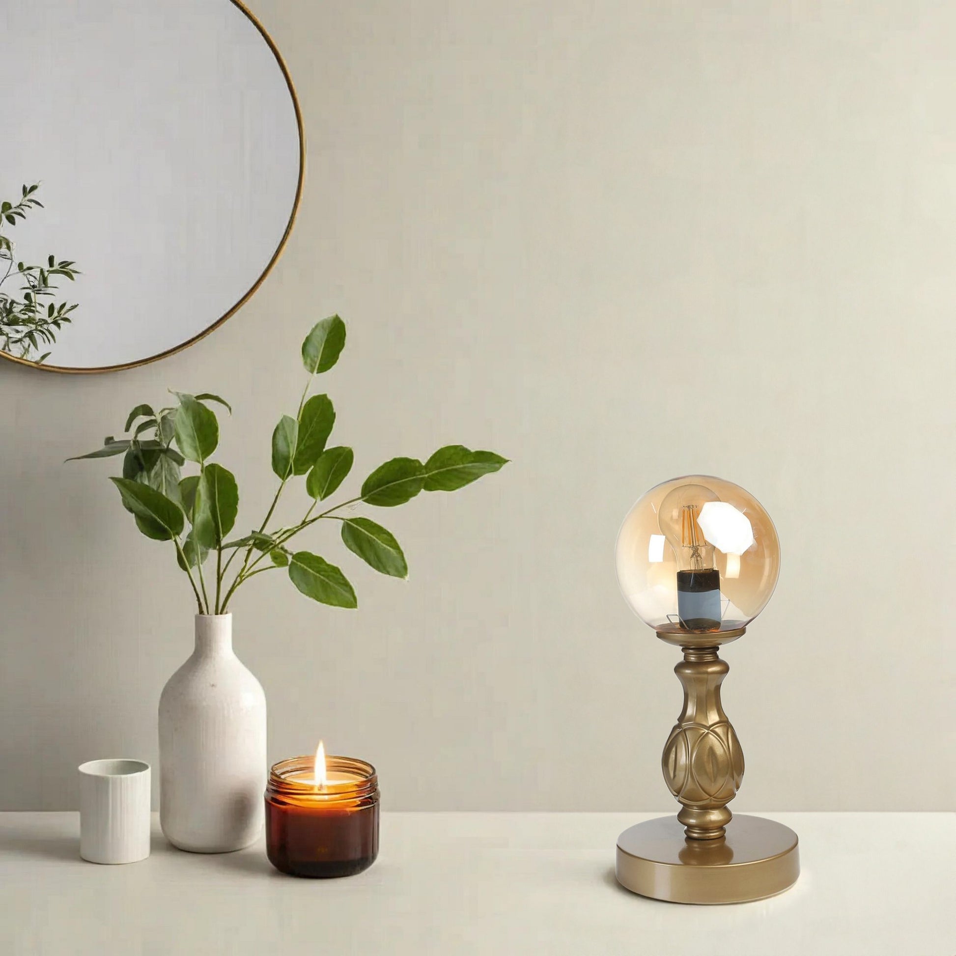 Ilumine seu espaço com o brilho quente e acolhedor de nossa deslumbrante Lâmpada de Mesa Âmbar e Dourada. Esta peça requintada apresenta um corpo de metal elegante e uma delicada cúpula de vidro, adicionando um toque de elegância a qualquer ambiente. O design único, com um diâmetro entre as pernas de 16 cm e uma altura total de 35 cm, faz dela uma peça de destaque na sua decoração.
