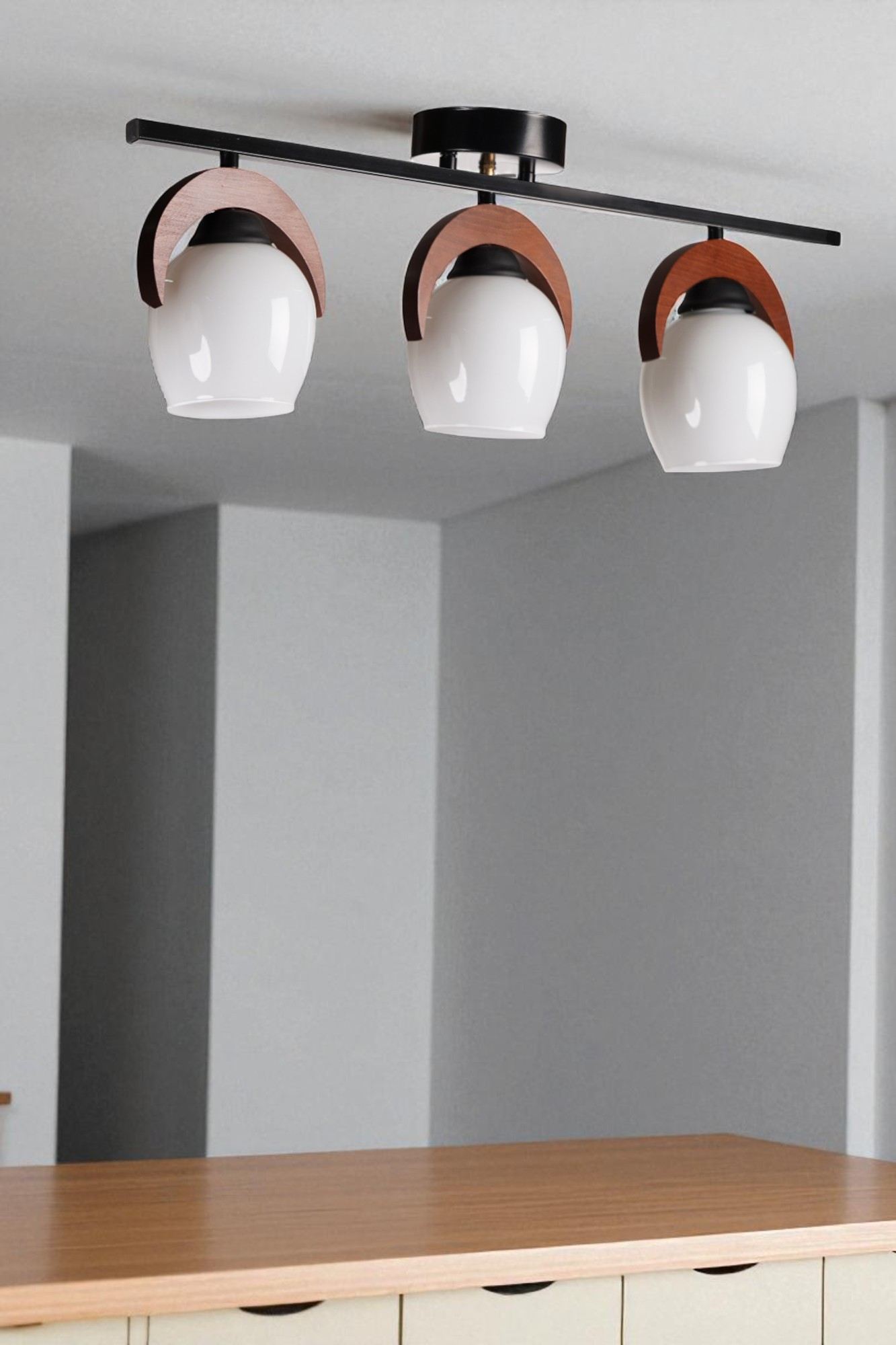 Candeeiro de Teto – Ø12 h:15 cm – Branco, Nogueira, Preto – Metal e Vidro
