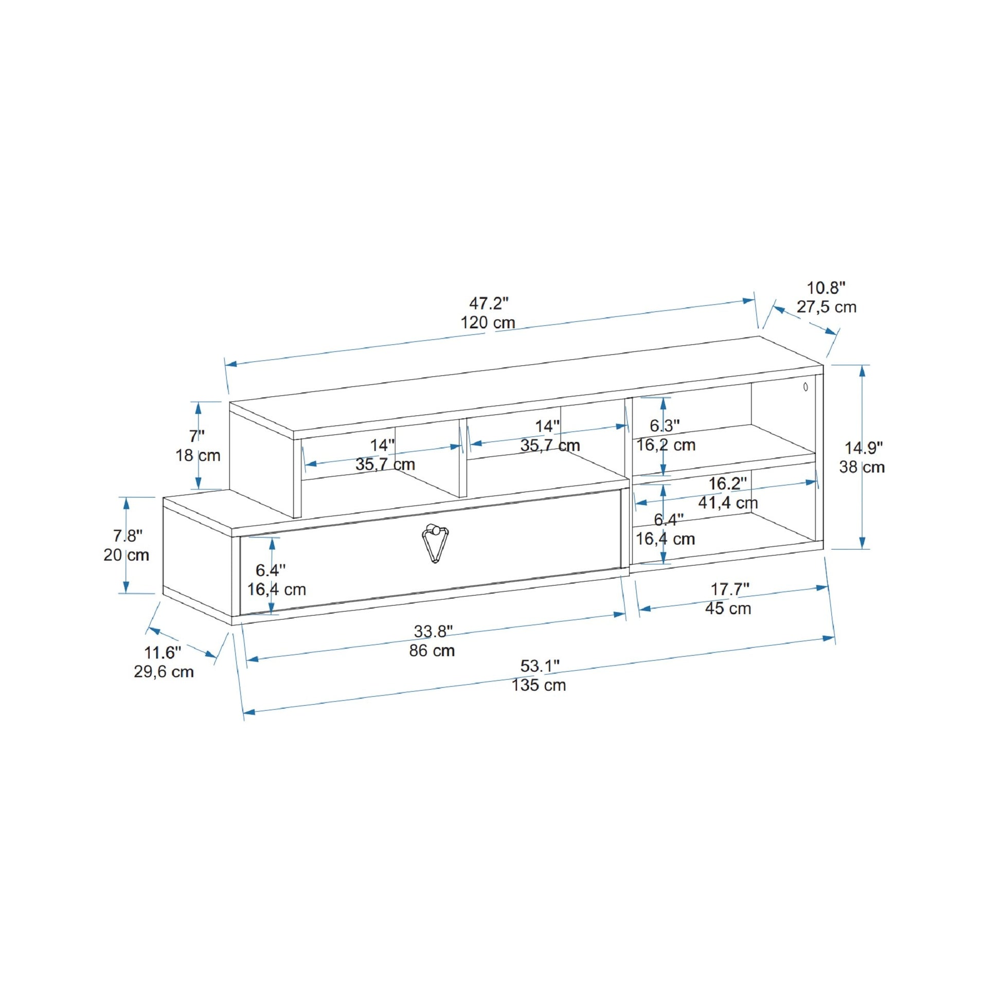 - Tamanho 1: Altura: 38cm, Largura: 120cm, Profundidade: 27,5cm