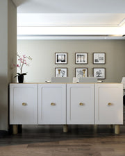 Com suas prateleiras espaçosas e amplo espaço de armazenamento, este console é perfeito para exibir suas peças de decoração favoritas, livros ou fotos de família. O design versátil permite que você misture e combine facilmente com seus móveis existentes, criando uma aparência coesa e estilosa em sua casa.