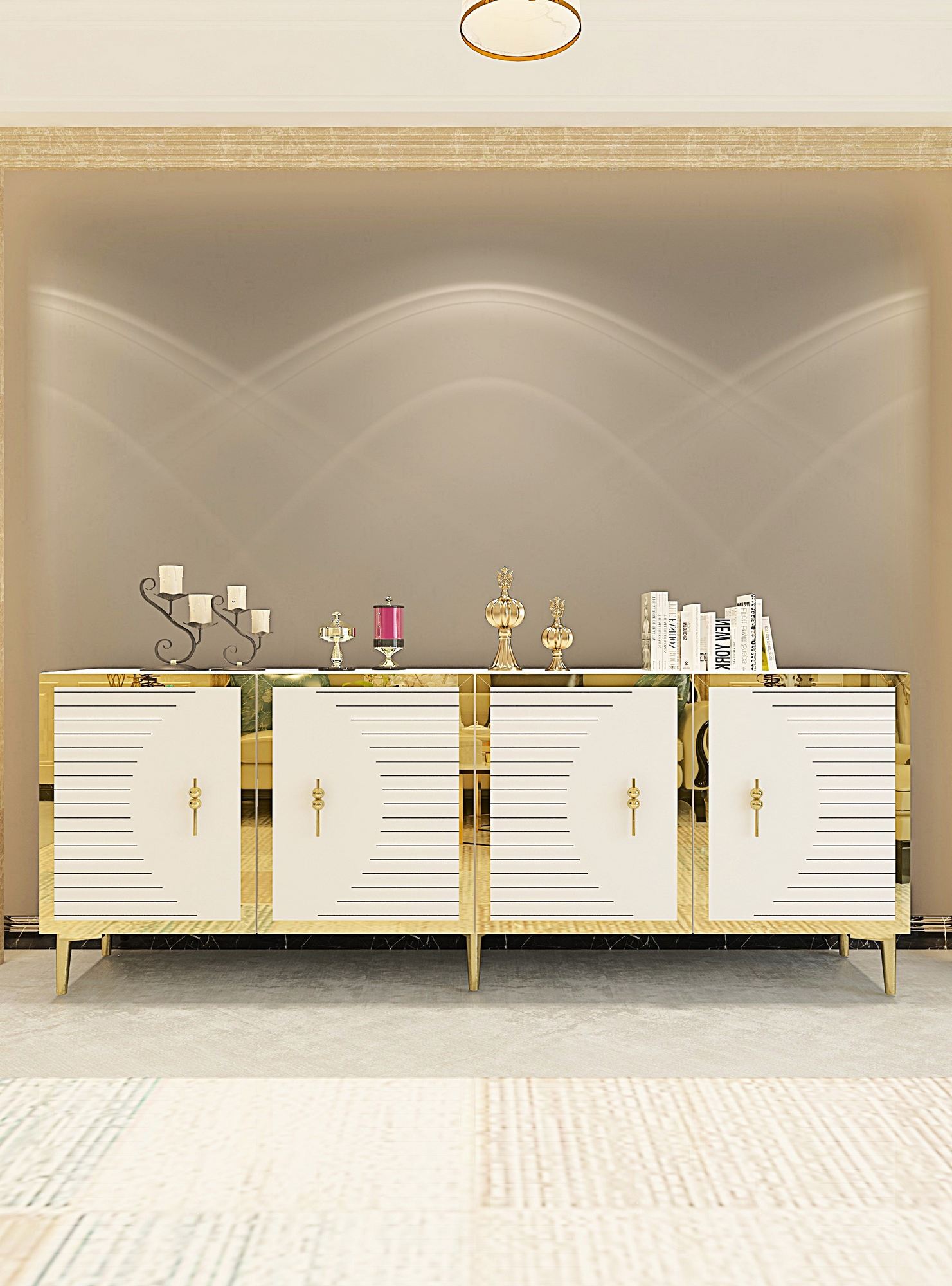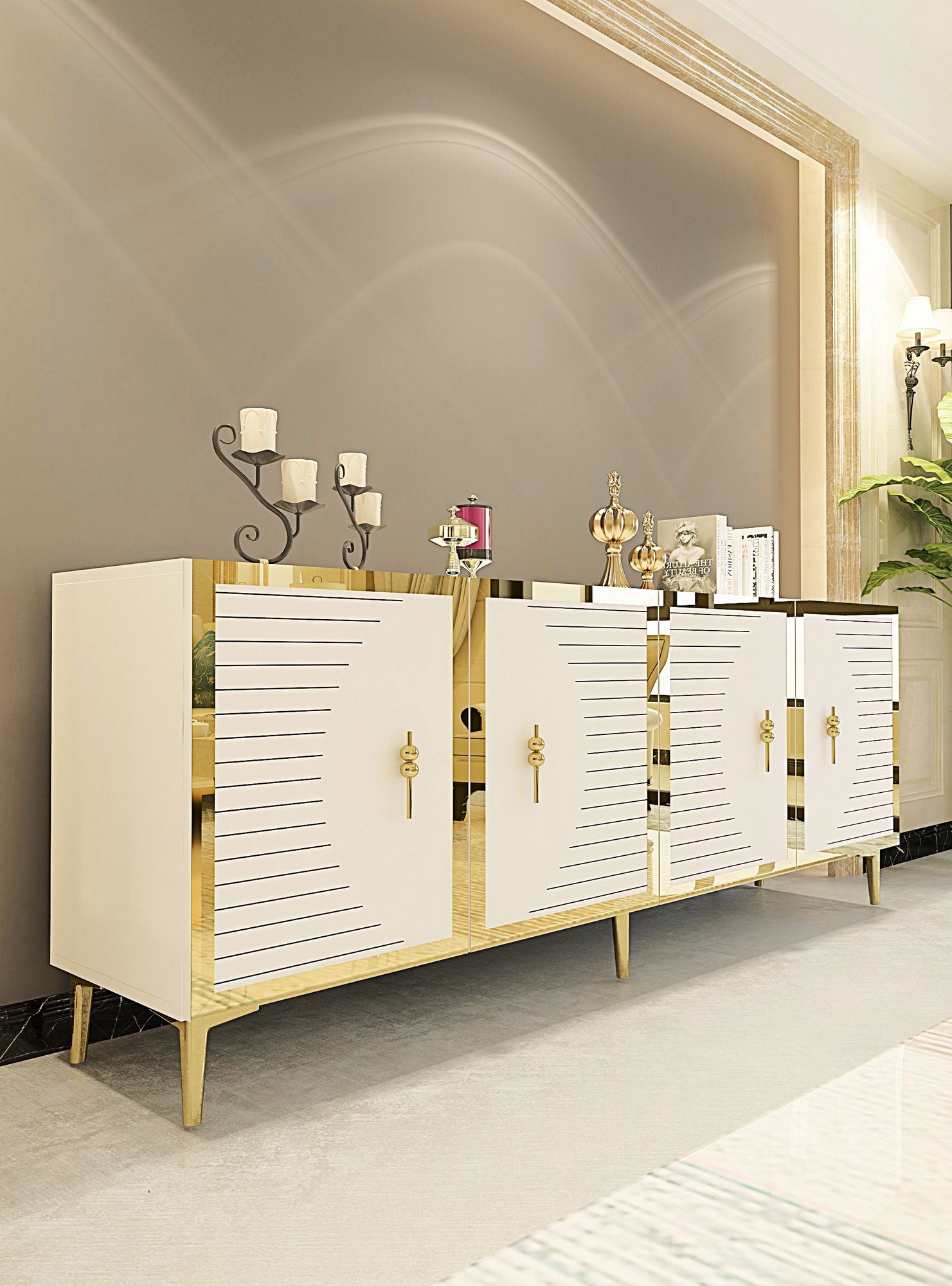 Adicione um toque de sofisticação à sua casa com nosso console, que apresenta um design moderno que complementa qualquer estilo de decoração. O acabamento branco elegante é realçado com detalhes em dourado, criando um visual luxuoso que impressionará seus convidados.