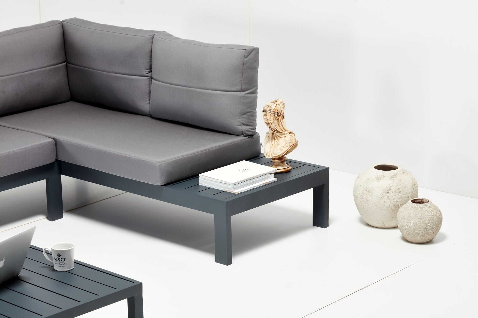 O elegante quadro de alumínio e o tecido de poliéster conferem a este conjunto de lounge um visual moderno e sofisticado que elevará a estética do seu espaço ao ar livre. O sofá de canto e a mesa de café são projetados para maximizar o conforto e a funcionalidade, facilitando o entretenimento de convidados ou simplesmente desfrutar de um momento tranquilo ao ar livre.