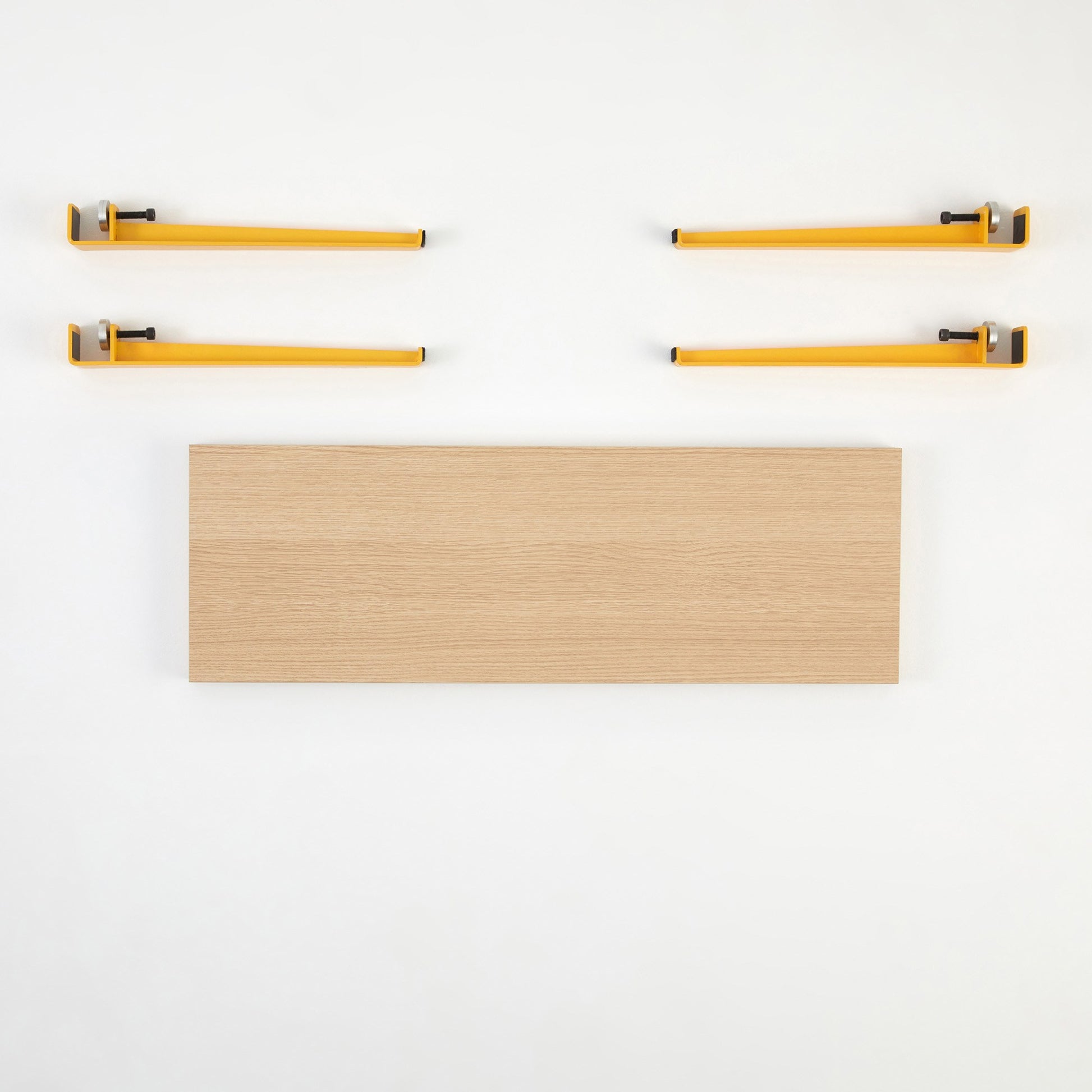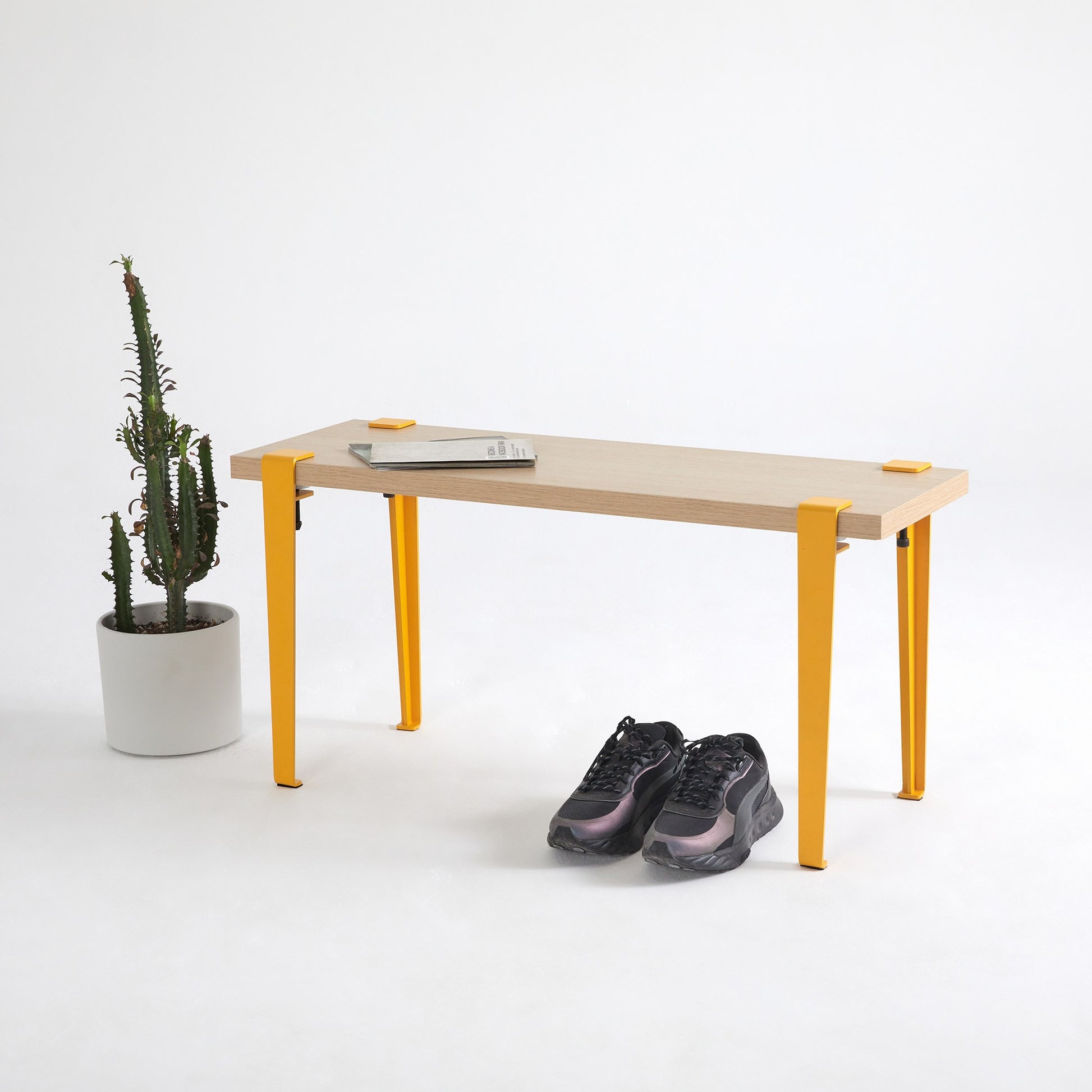 Este banco robusto e versátil é a solução perfeita para quem procura qualidade, durabilidade e praticidade num só produto. Com o seu acabamento em madeira amarela vibrante e pernas de aço preto, adiciona um toque contemporâneo a qualquer ambiente.