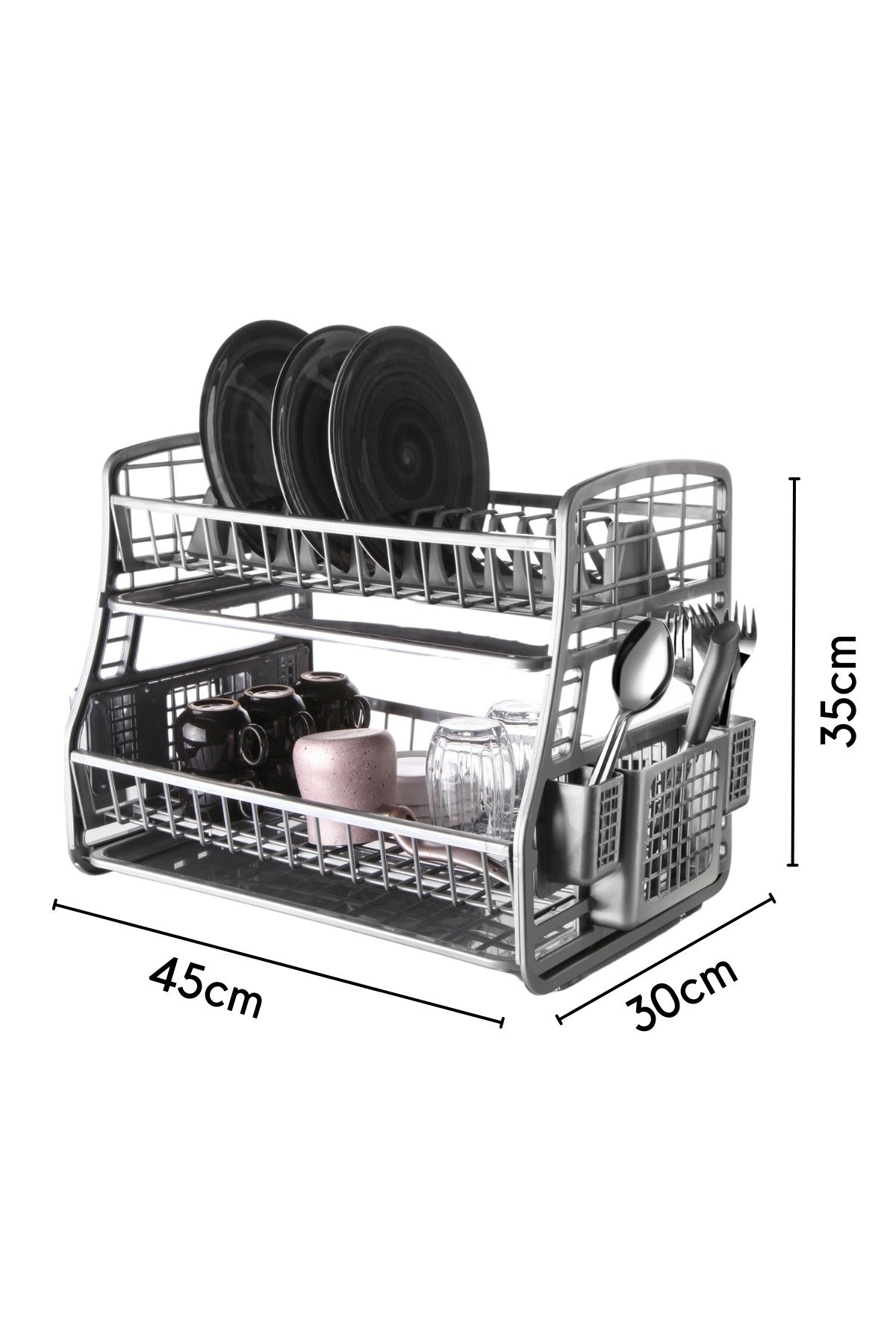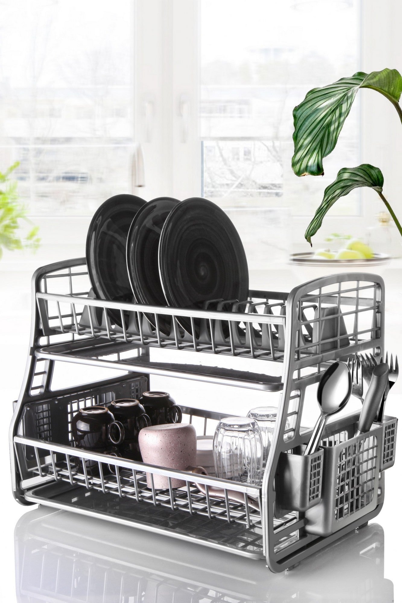 Nosso escorredor de pratos não é apenas funcional, mas também adiciona um toque de elegância moderna à decoração da sua cozinha. O design elegante e a cor antracite complementam qualquer estética de cozinha, tornando-o um item indispensável para qualquer lar.