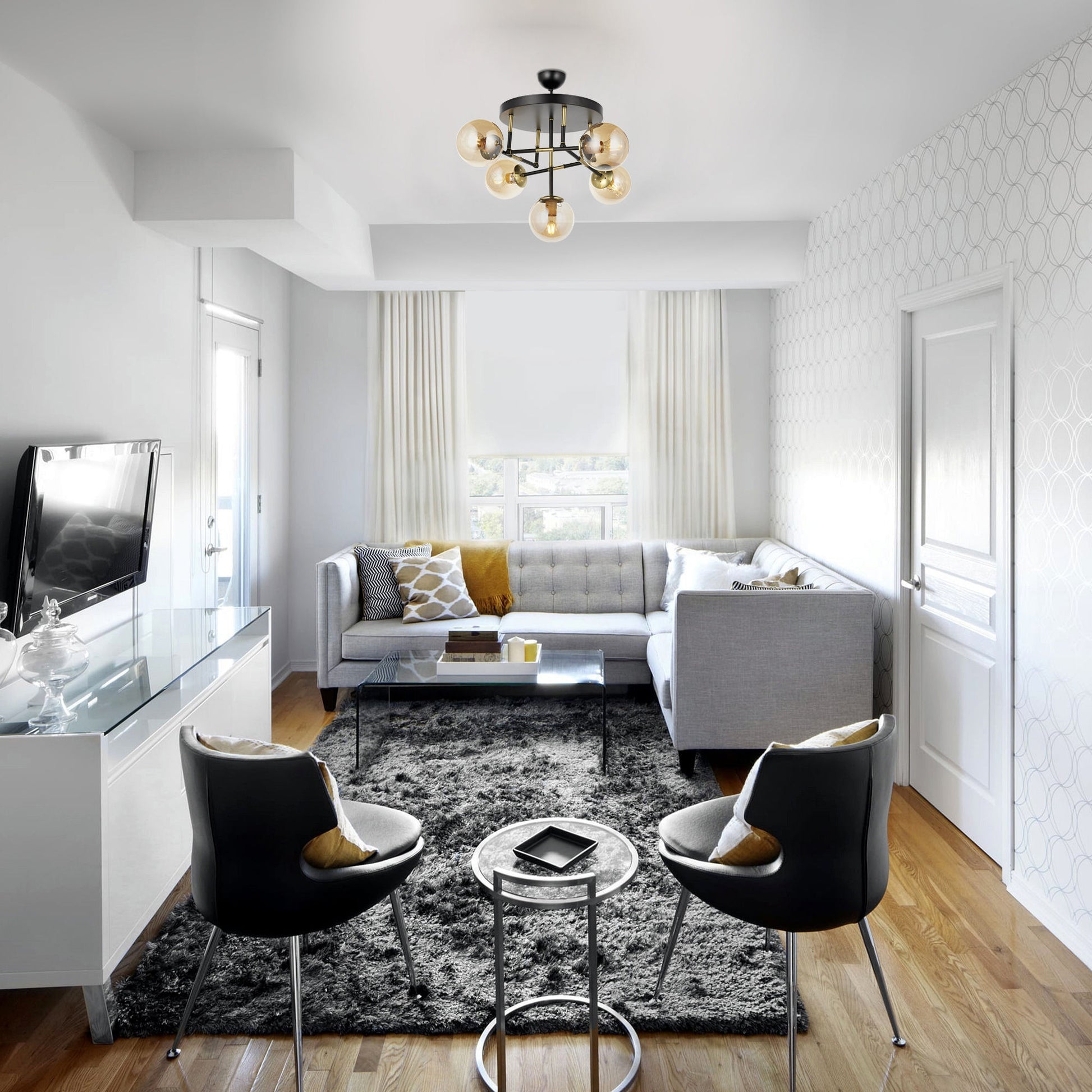 Com os seus cinco casquilhos e27, este candeeiro oferece uma iluminação ampla para iluminar qualquer divisão. Quer esteja a organizar um jantar ou a desfrutar de uma noite tranquila em casa, o brilho quente emitido por esta luminária criará uma atmosfera acolhedora e convidativa que fará com que os seus convidados se sintam em casa.