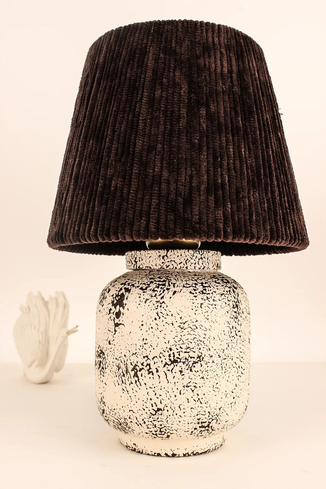 Ilumine seu espaço com a luminária de mesa de cerâmica elegante e sofisticada. Esta lâmpada deslumbrante apresenta um corpo de cerâmica com uma tampa de veludo luxuosa, adicionando um toque de glamour a qualquer sala. A combinação de cores creme e marrom adiciona calor e estilo à sua decoração, criando uma atmosfera aconchegante e convidativa.