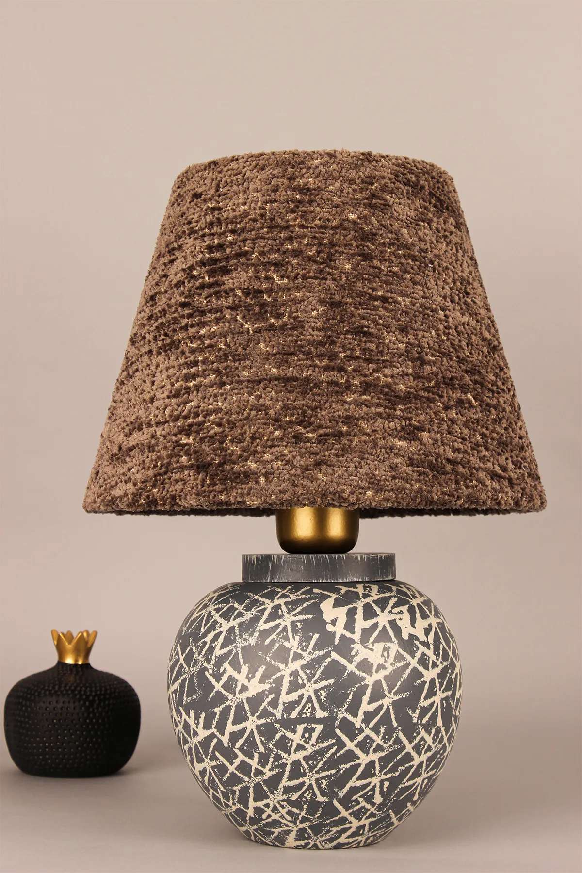 Ilumine seu espaço com o brilho quente e acolhedor de nossa Lâmpada de Mesa de Cerâmica. Esta peça deslumbrante apresenta um corpo de cerâmica lindamente trabalhado em uma rica paleta de cores marrom e cinza, adicionando um toque de elegância a qualquer ambiente. A tampa de veludo acrescenta um toque luxuoso, tornando esta lâmpada uma verdadeira peça de destaque em sua casa.