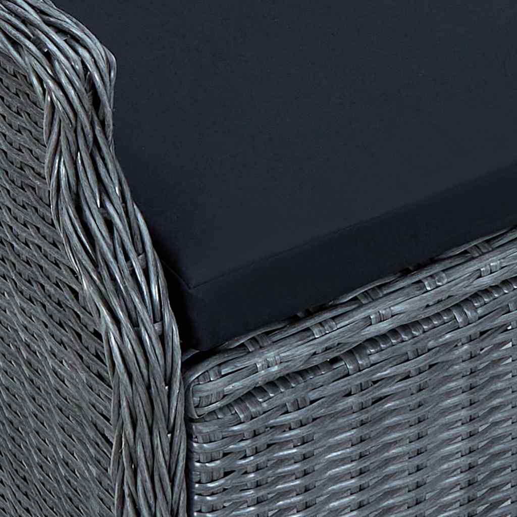 A mesa de jantar é feita em madeira de acácia maciça com um acabamento a óleo, o que a torna estável, durável e de fácil manutenção. A cadeira para exterior, com uma estrutura de aço revestido a pó e coberta com vime PE redondo, é resistente e fácil de limpar. Os almofadões densamente acolchoados atribuem um conforto adicional ao seu tempo de descanso. A capa do almofadão possui um fecho de correr para a poder remover e lavar. Graças ao mecanismo de elevação a gás, o encosto também é ajustável na posição que desejar. Ao tocar no botão lateral o encosto pode reclinar, para uma posição deitada confortável. A cadeira de jardim também é fácil de mover graças à sua construção leve.