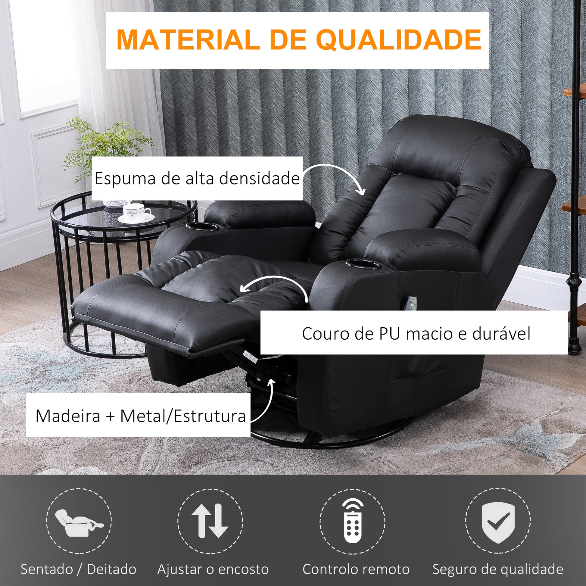 Poltrona Reclinável com Massagem Vibratória e Aquecimento – 85x94x104 cm – Preto – Couro sintético, metal e espuma