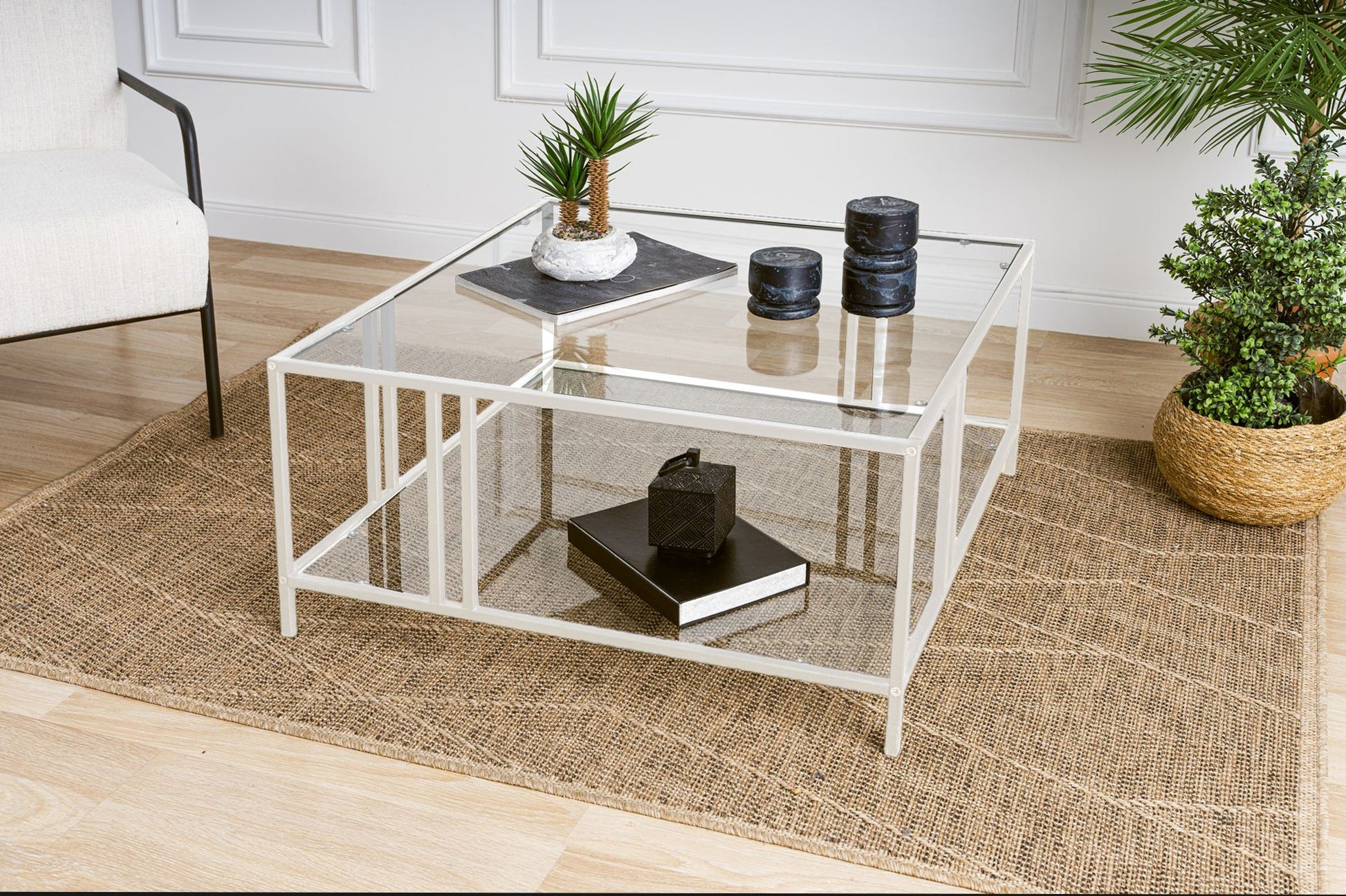 Mesa de Centro – 80 cm x 45 cm x 80 cm – Branco e Transparente – Vidro e Metal