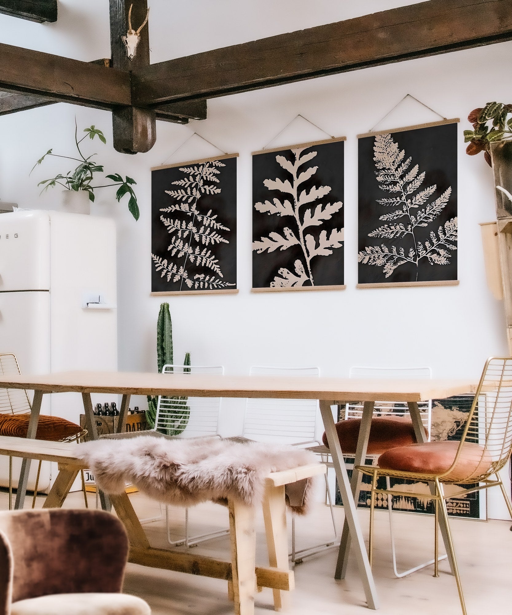 Cada peça foi cuidadosamente selecionada para criar harmonia visual perfeita. As molduras em madeira natural conferem um toque de sofisticação, enquanto a combinação de poliéster e algodão garante cores vibrantes que resistem ao tempo.