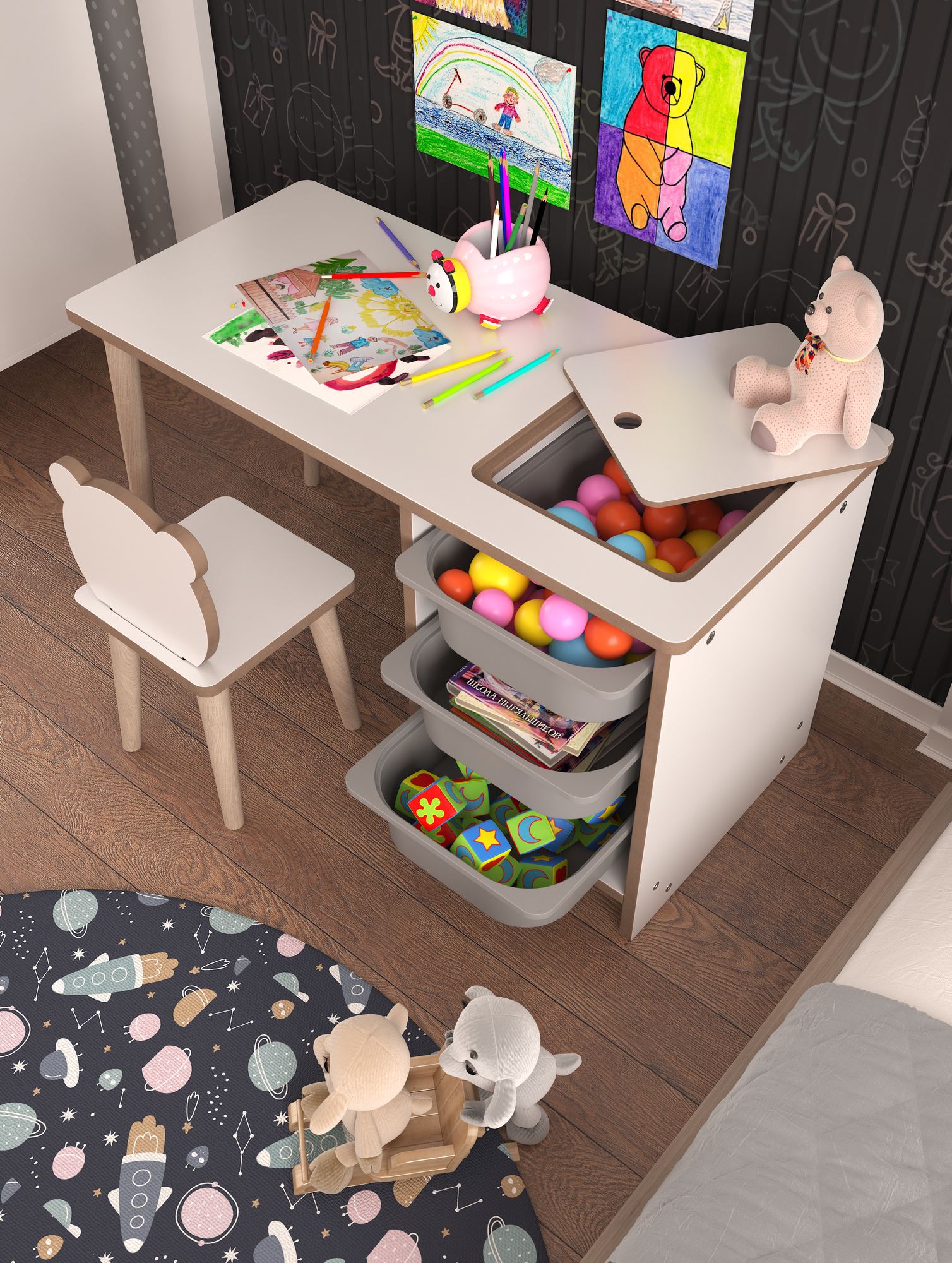 A mesa possui uma gaveta de plástico conveniente para armazenar canetas, cadernos e outros itens essenciais, mantendo seu espaço de trabalho livre de bagunça e sua mente focada. O tamanho da mesa de 90 cm oferece amplo espaço para seu laptop, livros e materiais de estudo, enquanto o tamanho da cadeira de 25 cm garante assentos confortáveis para longas sessões de estudo.