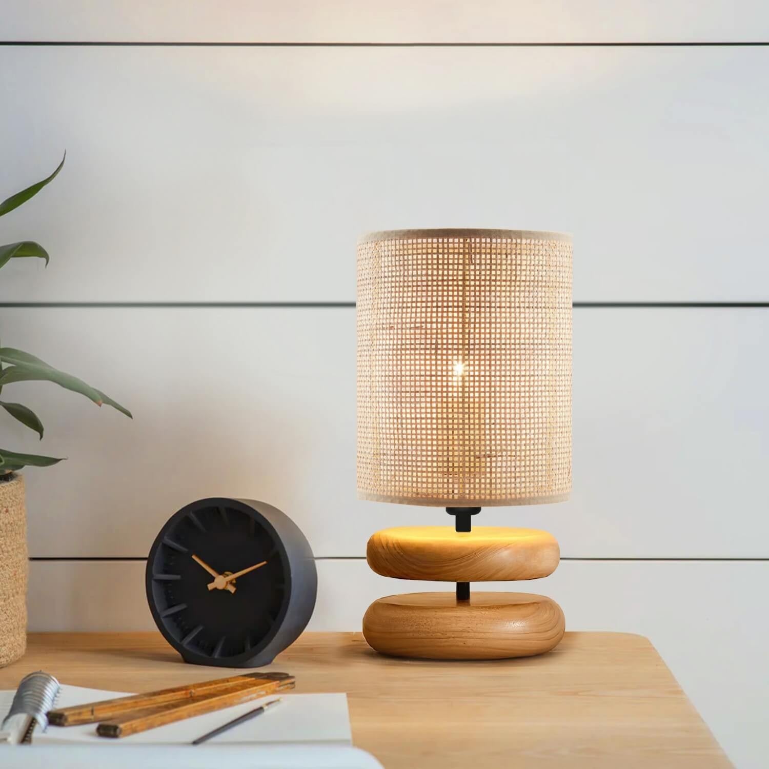 O corpo de madeira deste candeeiro de mesa traz um toque de natureza para o interior, criando uma atmosfera acolhedora e convidativa em qualquer divisão. A tampa em bambu acrescenta um elemento único e elegante, tornando este candeeiro uma peça de destaque na decoração da sua casa.