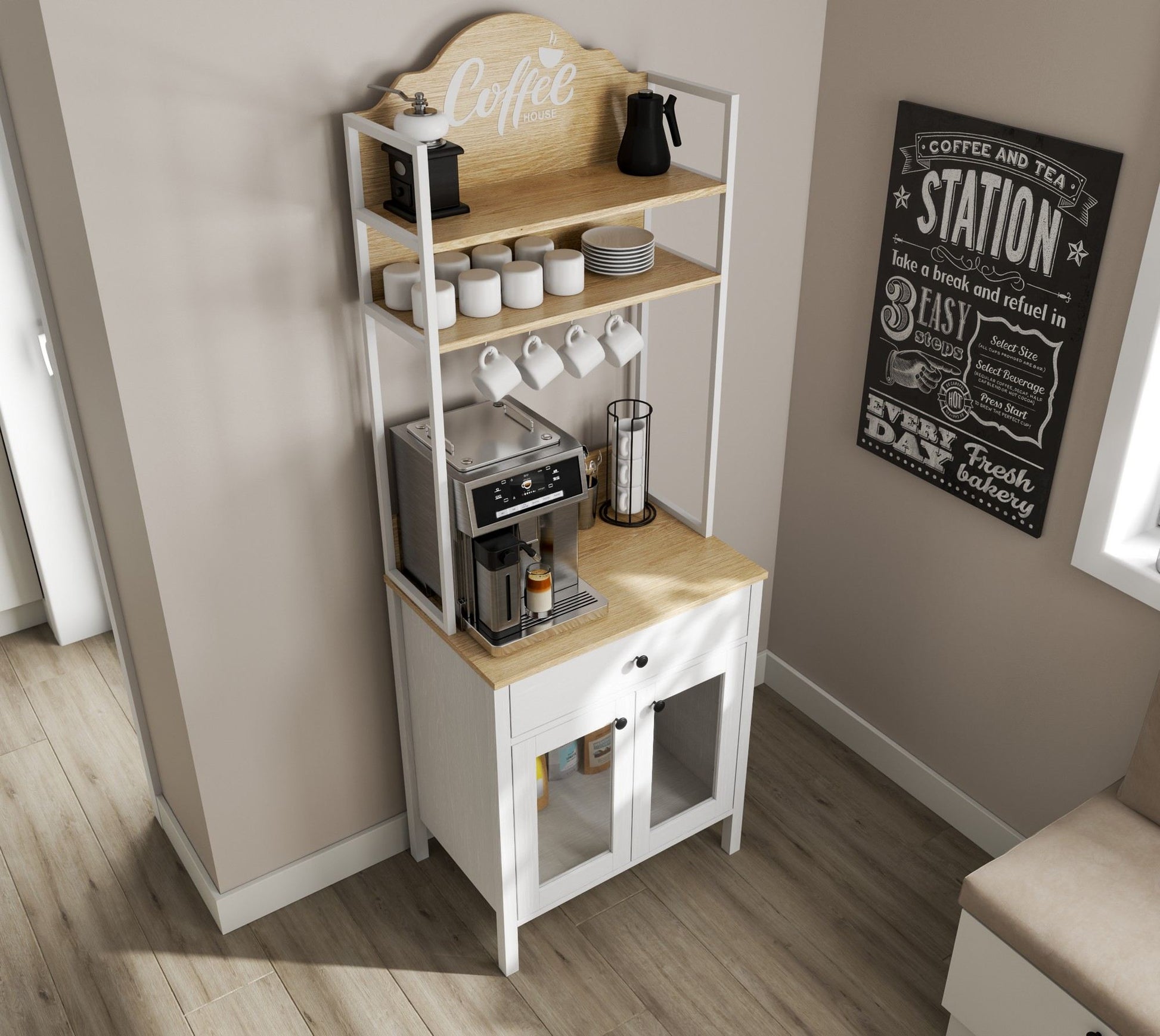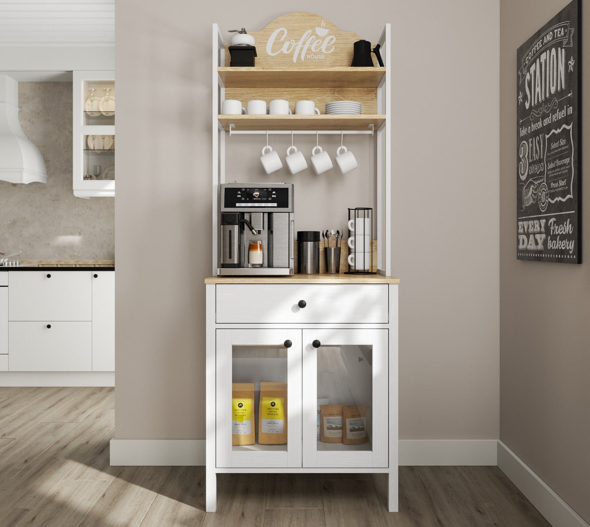 Com seu design elegante e esquema de cores moderno, este Armário de Café elevará instantaneamente qualquer ambiente da sua casa. A combinação de cores madeira e branca cria um visual atemporal que nunca sai de moda.