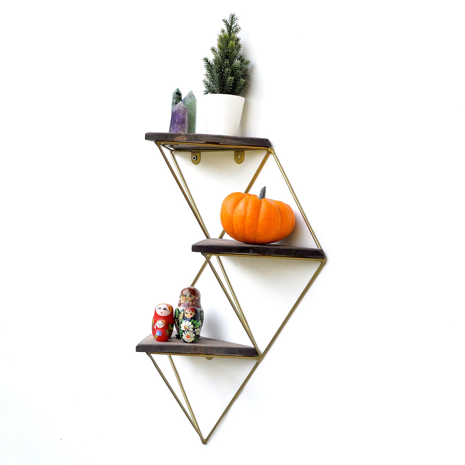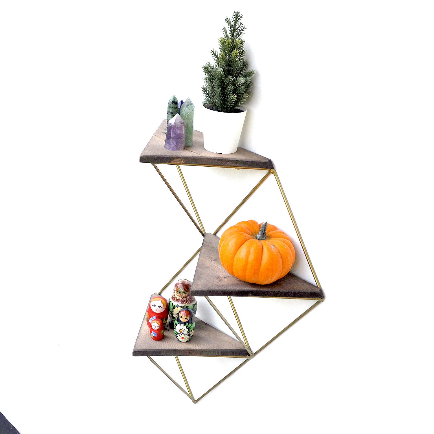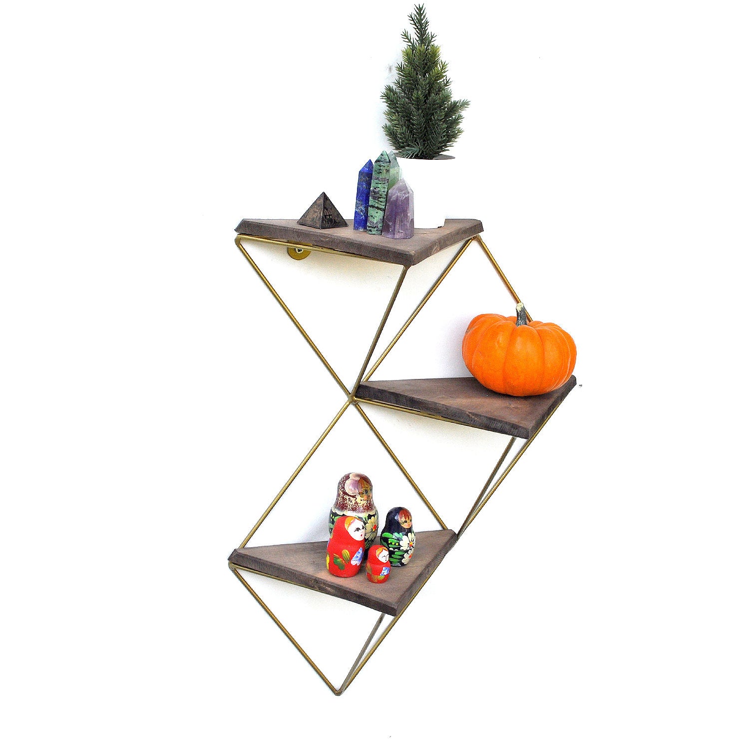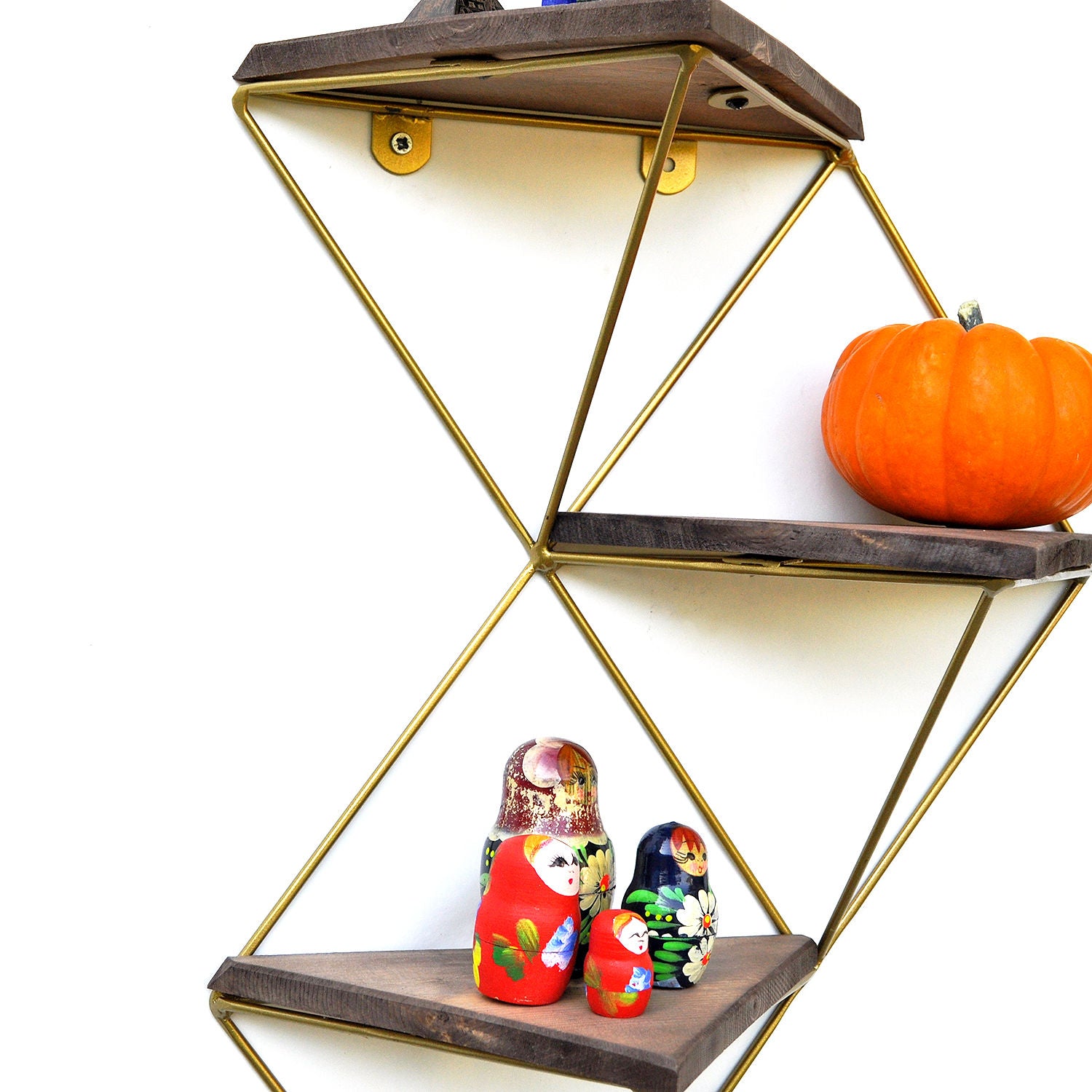 Prateleira decorativa de parede em madeira – 34 cm x 45 cm x 13 cm – Nogueira e Dourado