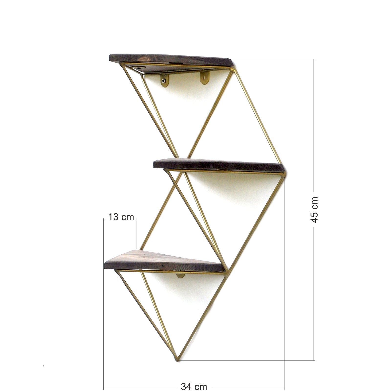 Com 34 cm de largura, 45 cm de altura e 13 cm de profundidade, esta prateleira de parede oferece um espaço amplo para expor os seus objectos decorativos favoritos, livros ou plantas. A combinação de cores nogueira e dourado dá um toque de luxo e sofisticação a qualquer divisão, tornando-a um complemento perfeito para a decoração da sua casa.