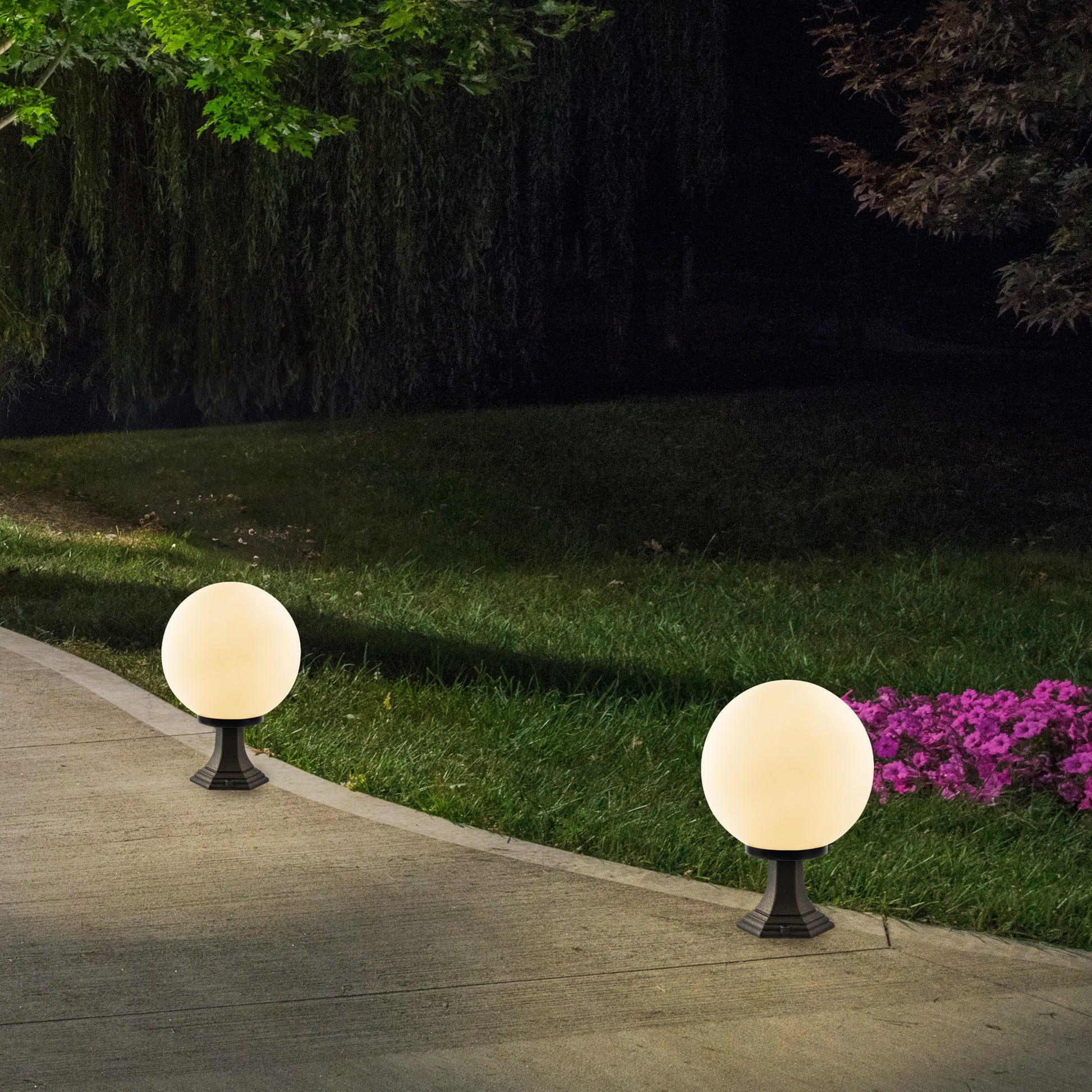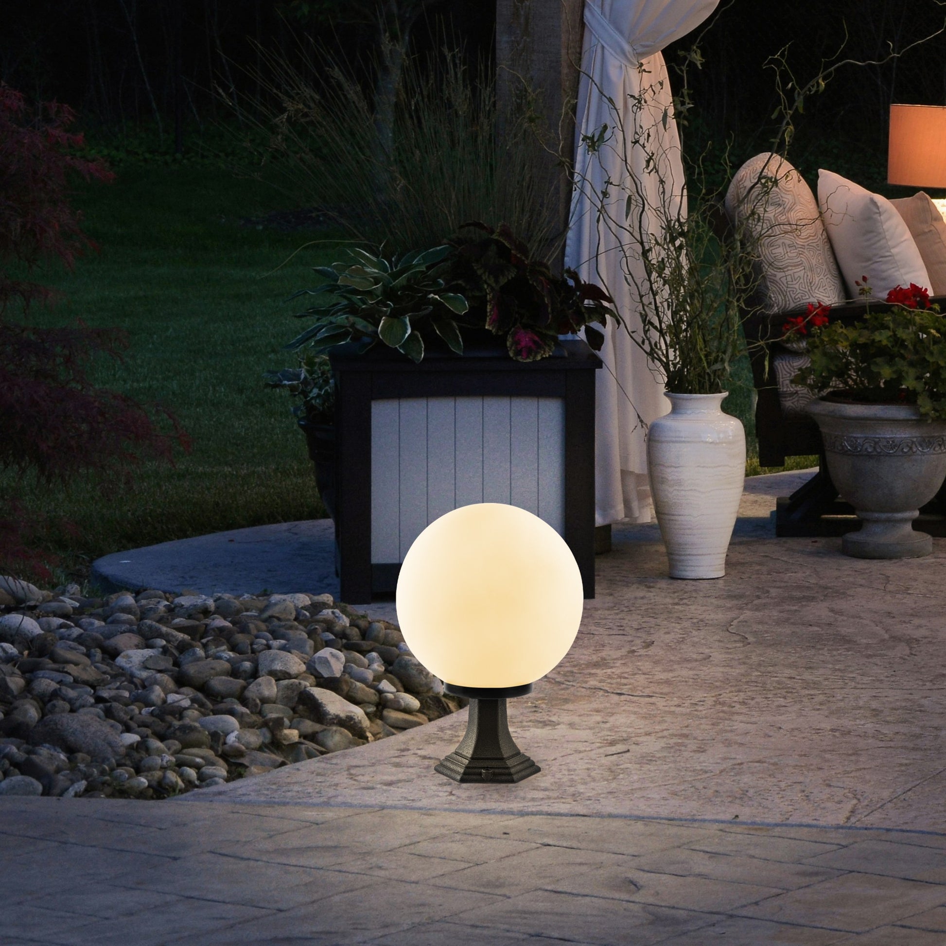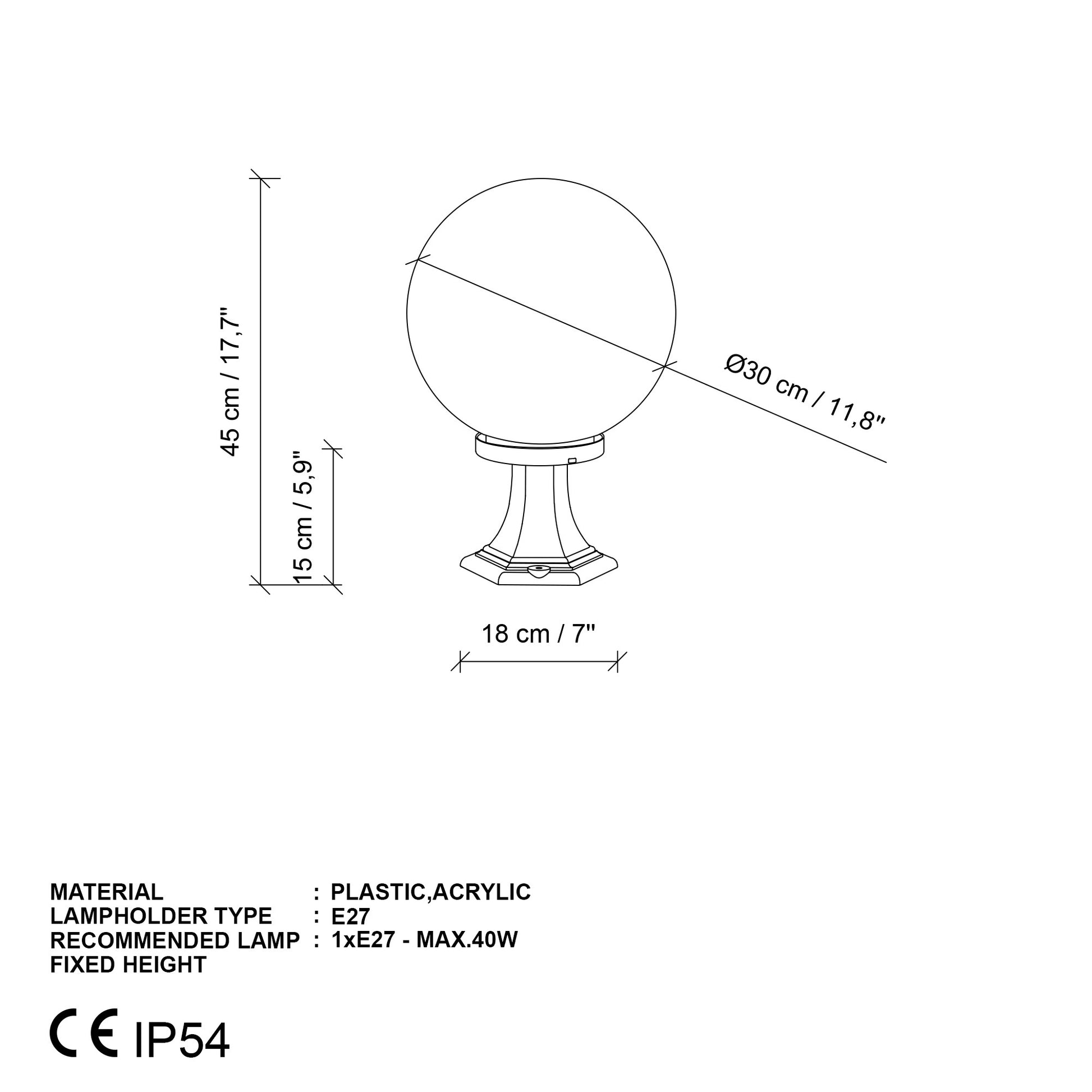 Ilumine o seu espaço exterior com o nosso deslumbrante candeeiro de pé para exterior. Este candeeiro elegante e moderno apresenta um corpo de plástico com uma tampa de acrílico, criando um design bonito e duradouro que irá melhorar qualquer ambiente exterior. O globo tem um diâmetro de 30 cm e uma altura total de 45 cm, o que o torna o tamanho perfeito para adicionar um brilho quente e convidativo ao seu pátio, deck ou jardim.