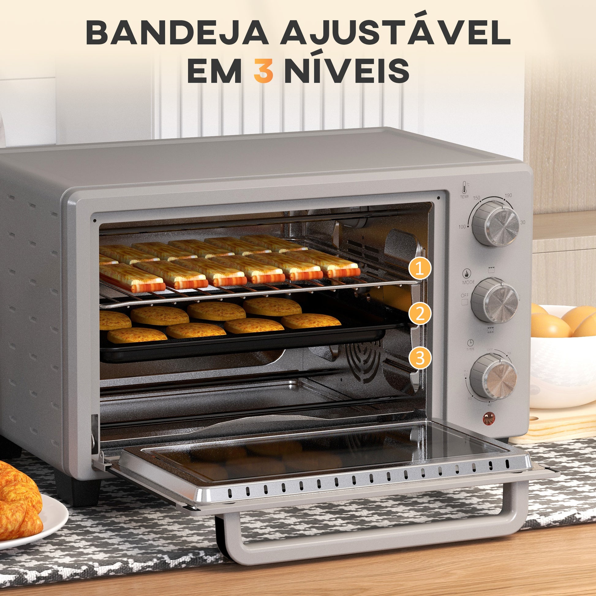 - Benefícios: Temperatura ajustável de 100°C a 230°C, temporizador de até 60 minutos, opção de cozinhar com grelhador superior, inferior ou ambos