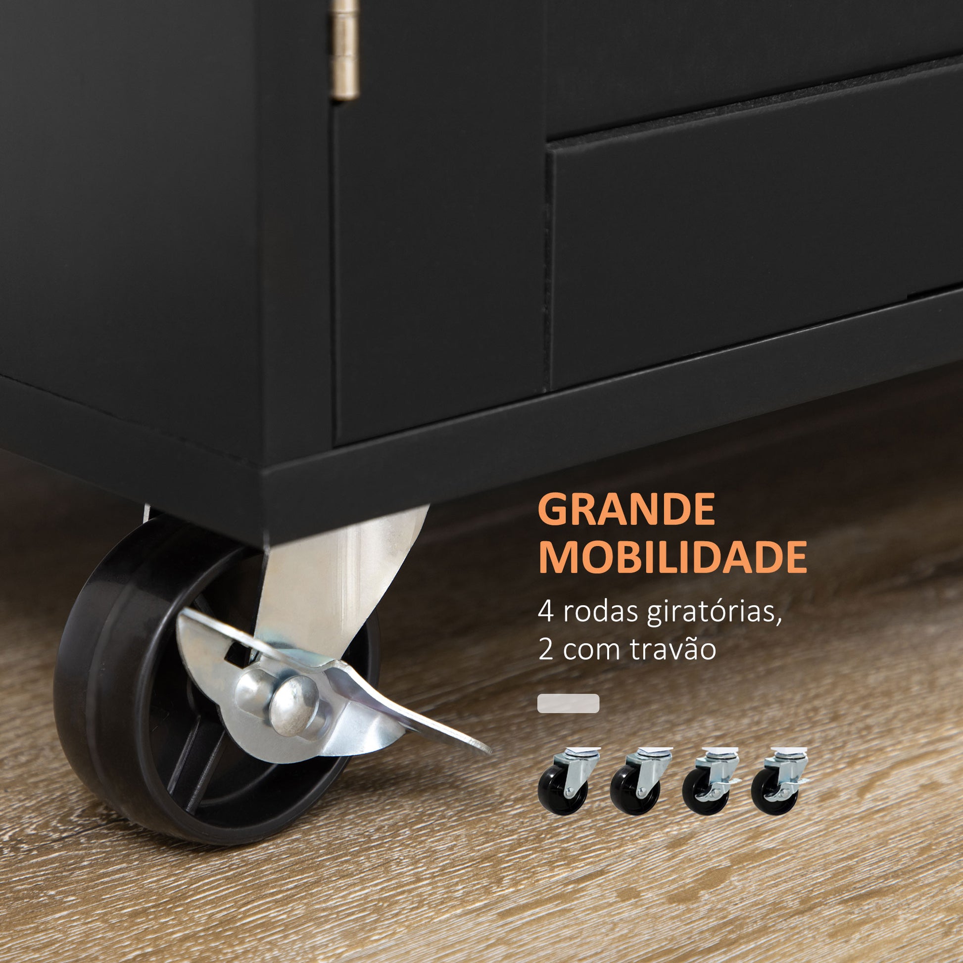 O Carrinho de Cozinha Preto oferece um amplo espaço de armazenamento e praticidade para a sua cozinha ou qualquer outro ambiente da casa. Com armário, gaveta, barra de pendurar e suporte para temperos, este móvel é ideal para organizar utensílios e adicionar um toque de elegância ao seu espaço.