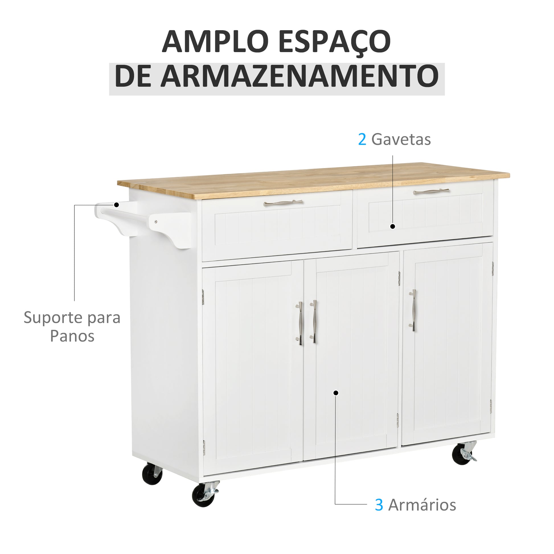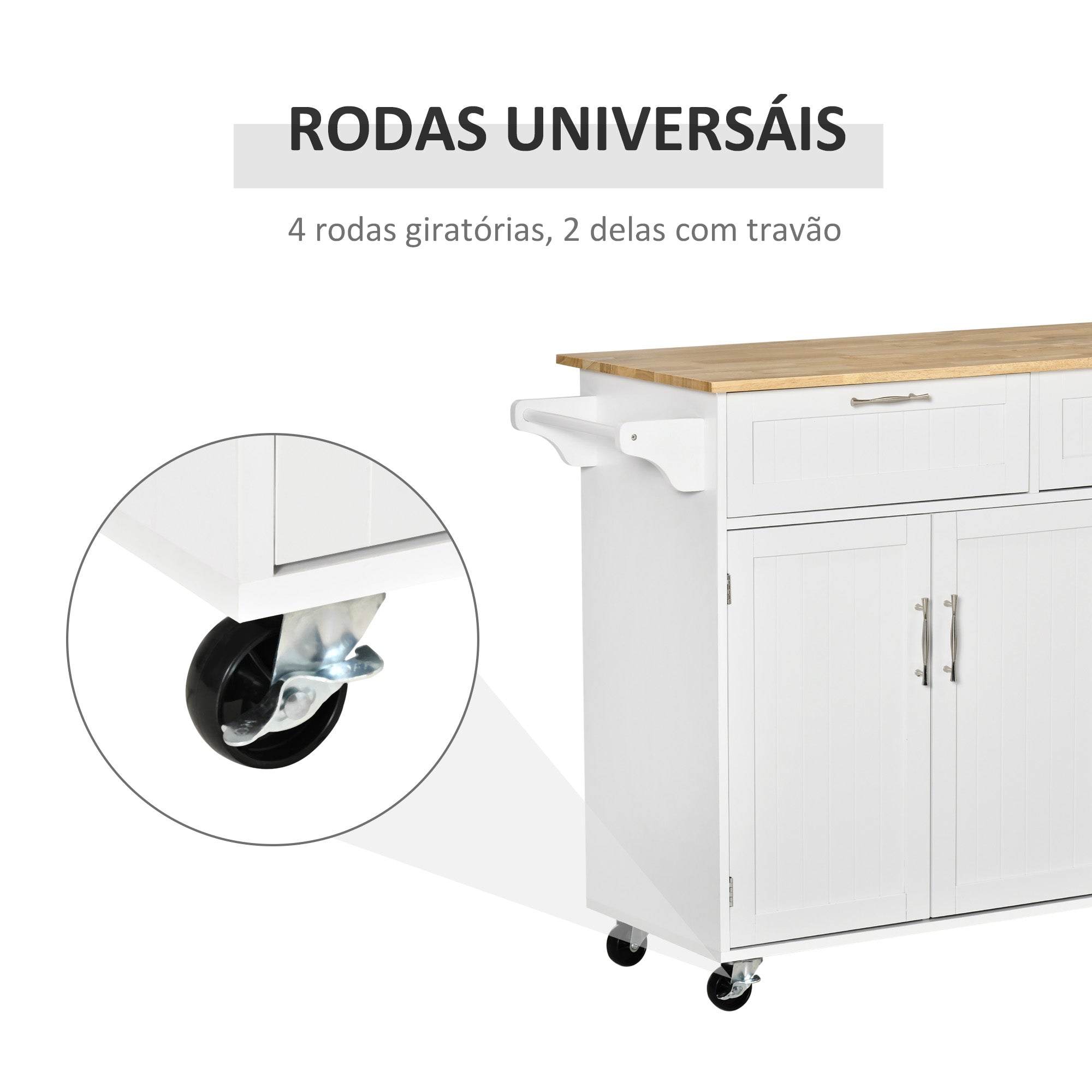 Carrinho de Cozinha Multiuso – 121x46x91 cm – Branco – MDF e madeira de borracha