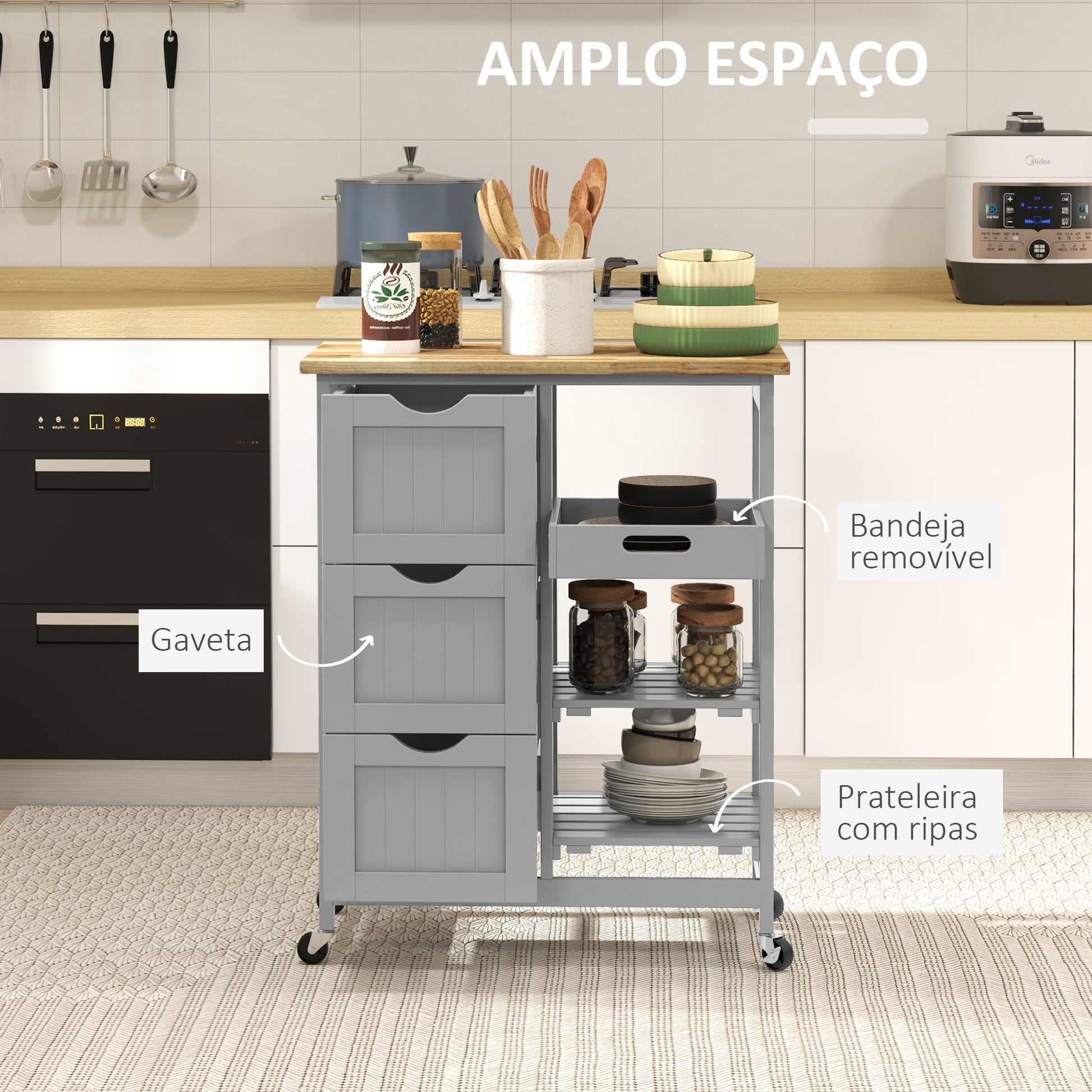 Este carrinho de cozinha compacto é a solução perfeita para adicionar espaço extra à sua cozinha. Com 3 gavetas, 2 prateleiras abertas e uma bandeja removível, é ideal para festas e reuniões.