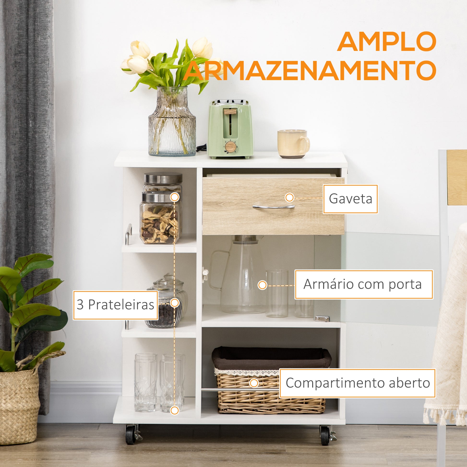 - Benefícios: Oferece amplo espaço de armazenamento com 1 gaveta, 3 prateleiras abertas, 1 compartimento aberto e 1 armário com porta de vidro; rodas giratórias para fácil movimentação.