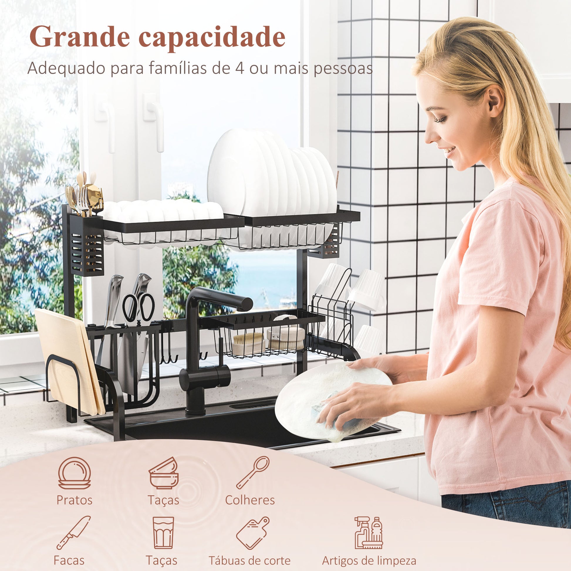 - Benefícios: Com capacidade máxima de peso de 26kg, este escorredor oferece espaço para pratos, tigelas, talheres, facas, copos e até mesmo detergente.
