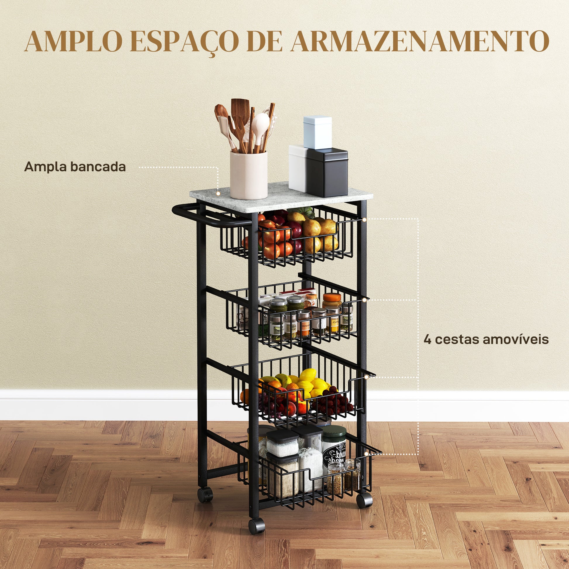 Organize sua cozinha com praticidade usando este carrinho de cozinha com 4 cestas e estrutura resistente.