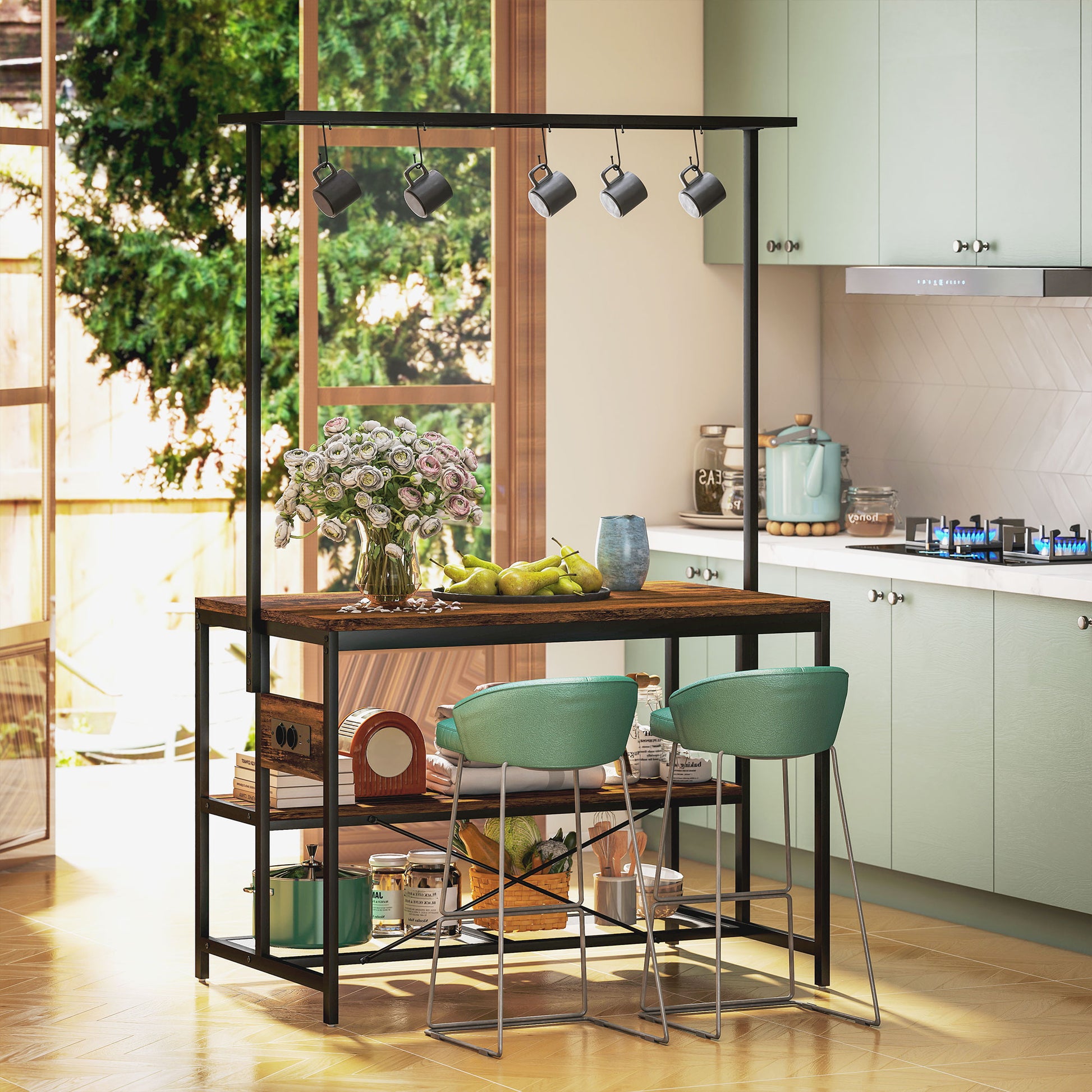 Organize sua cozinha com praticidade e estilo com esta estante de cozinha com tomada de corrente. Com duas prateleiras espaçosas, uma ampla bancada e cinco ganchos para chavenas, este móvel auxiliar é perfeito para manter seus utensílios bem organizados.