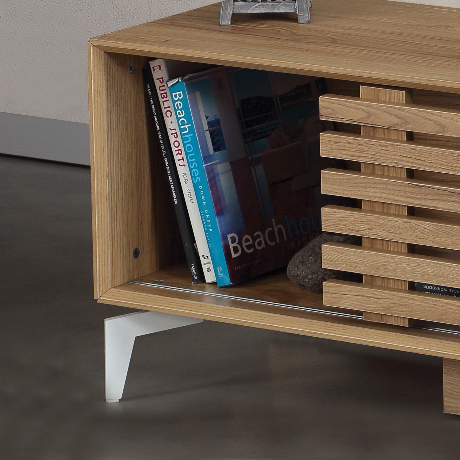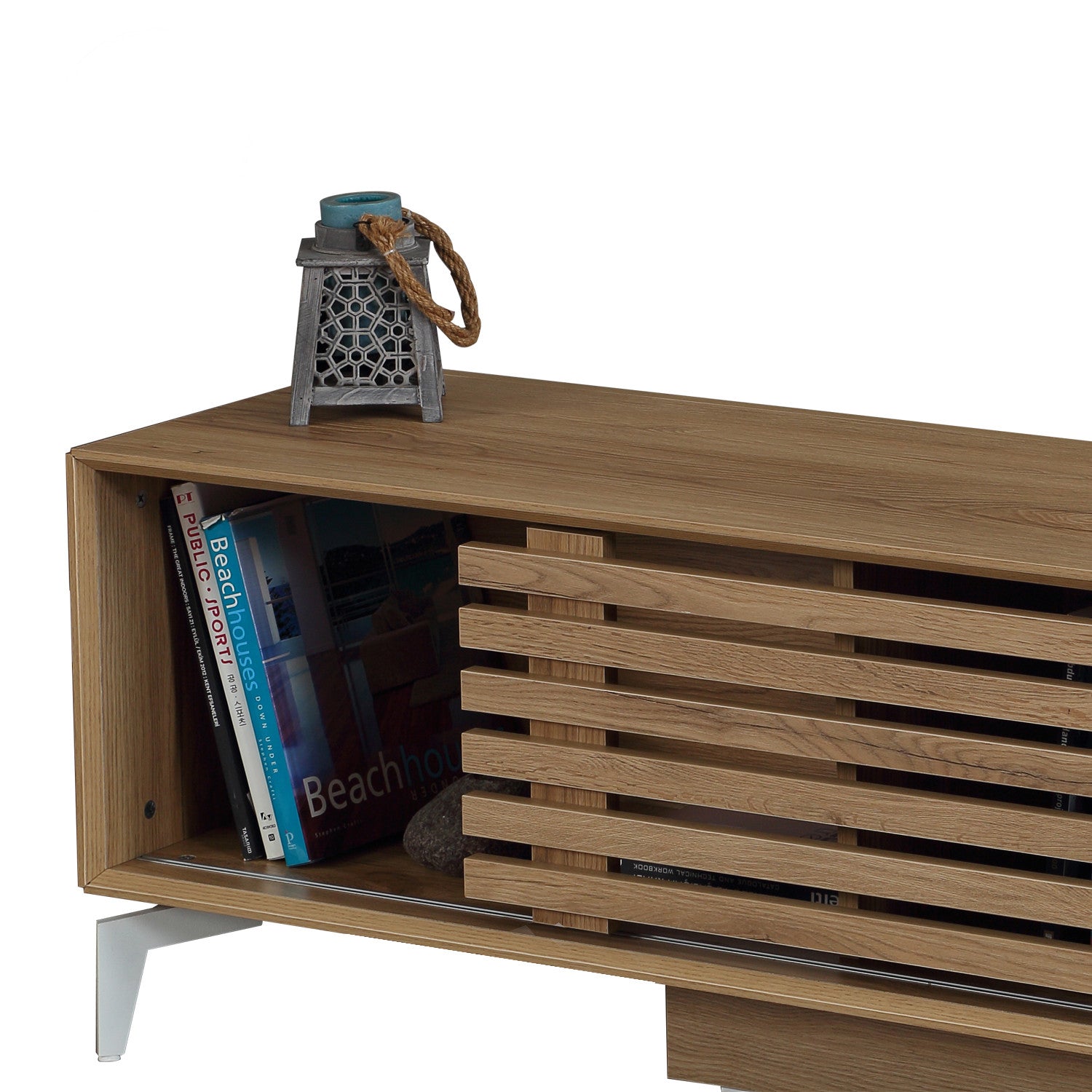 Fabricado a partir de painéis de partículas 100% revestidos a melamina, este suporte para televisão foi concebido para durar. A espessura de 18 mm garante robustez e estabilidade, tornando-o capaz de suportar o seu televisor e outros dispositivos multimédia com facilidade. As pernas metálicas não só dão um toque de sofisticação, como também proporcionam apoio e durabilidade adicionais.