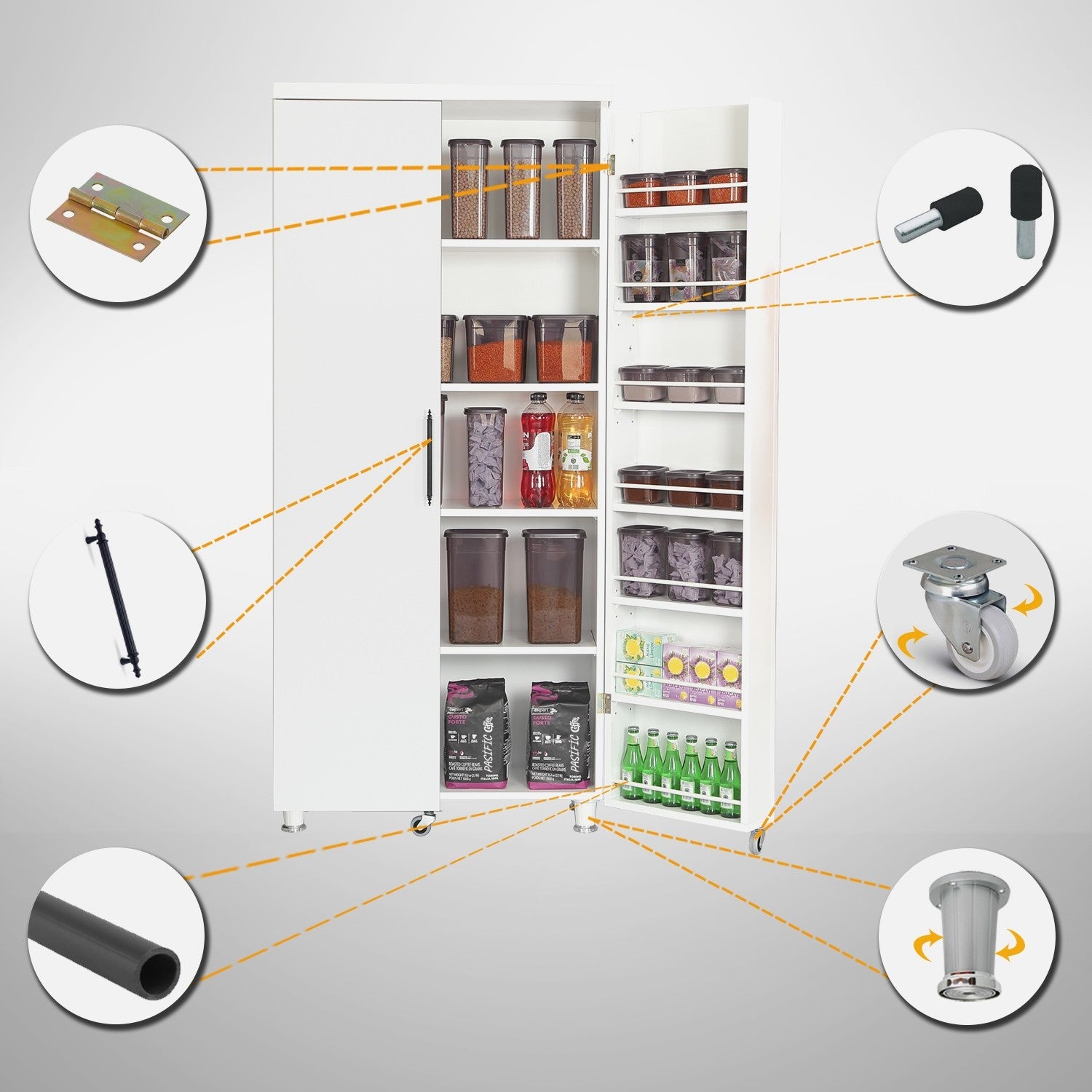 O armário também inclui opções de arrumação adicionais e capas com rodas para facilitar a mobilidade. A cor branca elegante acrescenta um toque de elegância a qualquer divisão, tornando-o numa adição elegante e prática à decoração da sua casa.