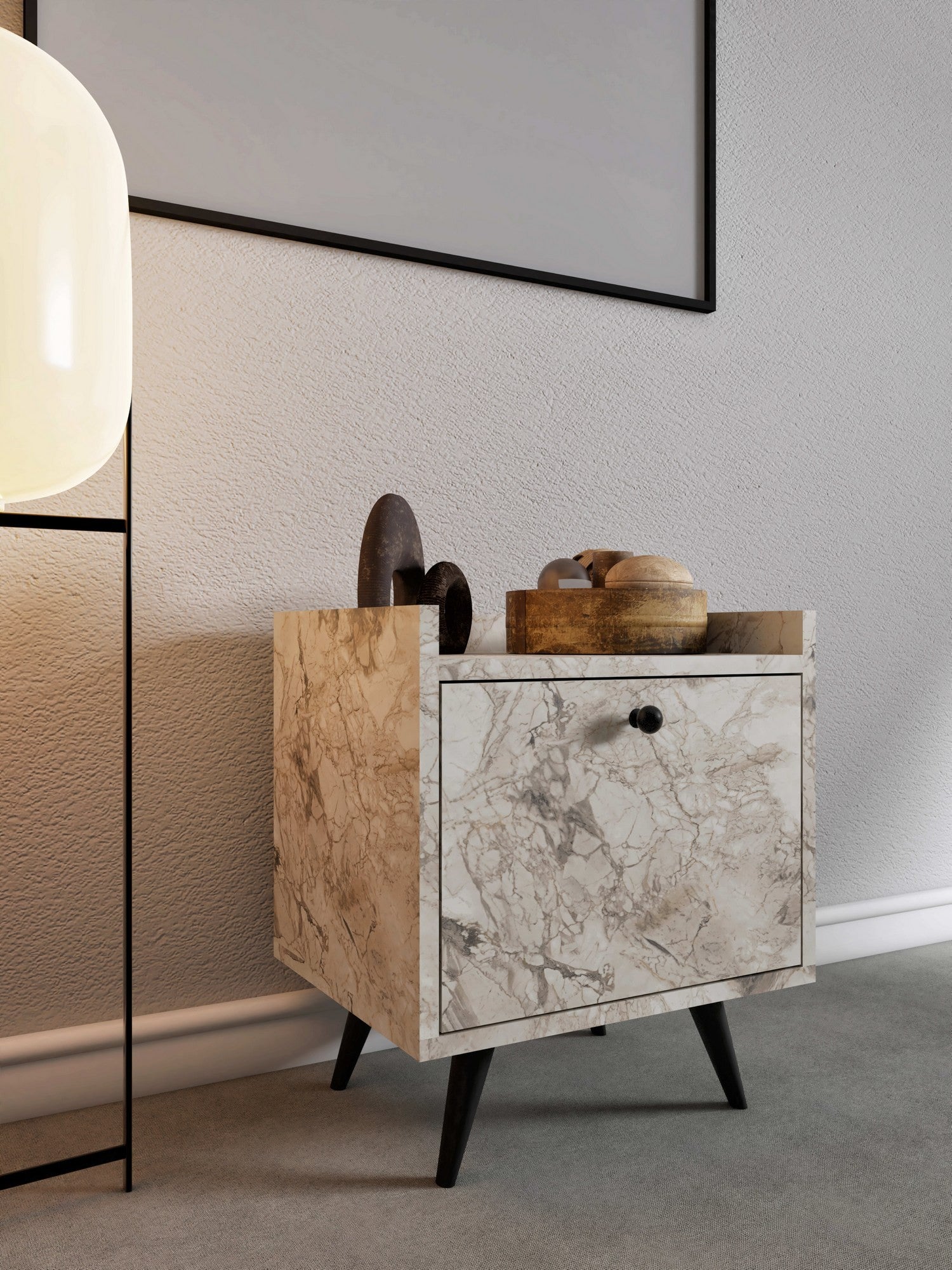 Mesa de cabeceira – 50 cm x 55 cm x 40 cm – Mármore de Éfeso – Madeira e painel de partículas