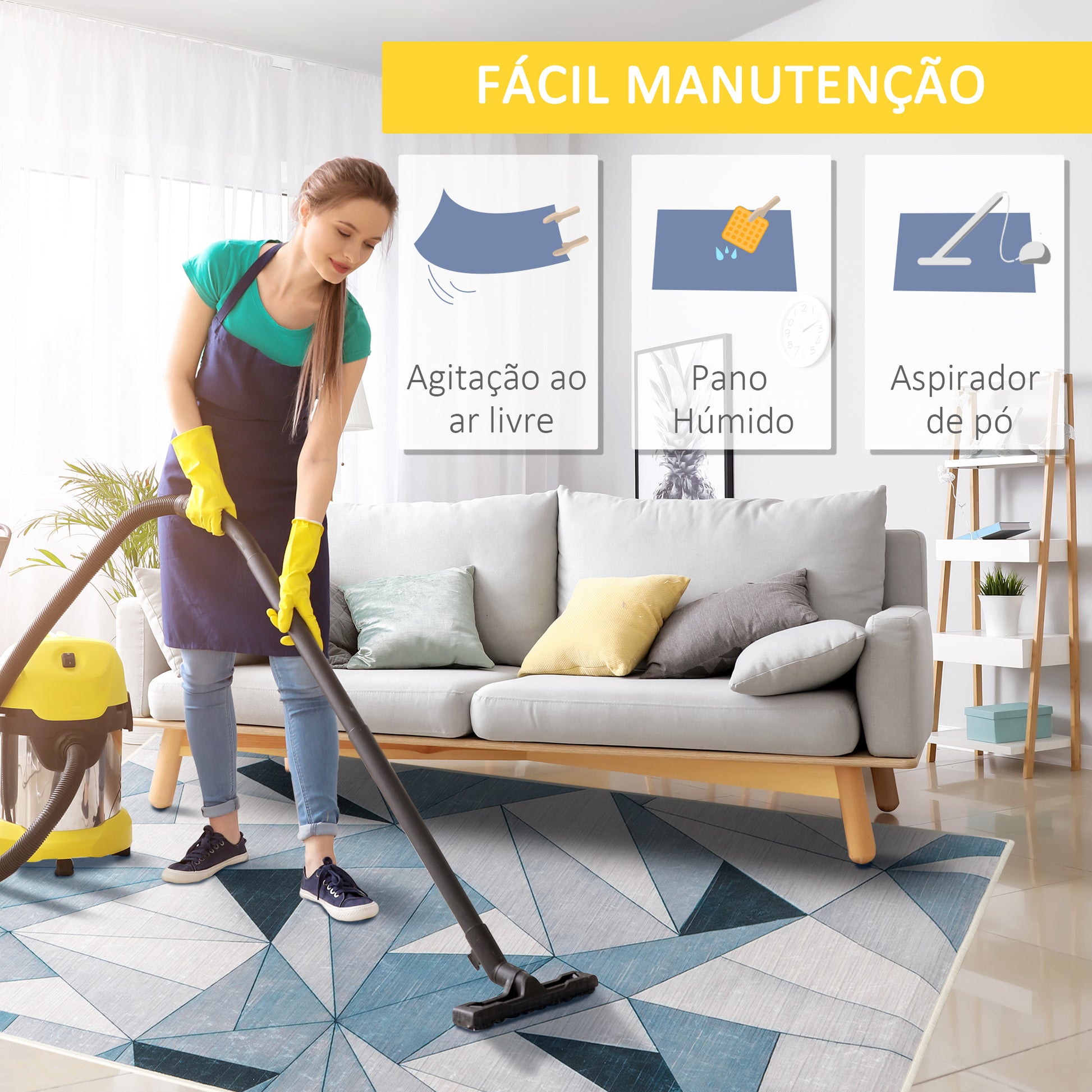 - Outras especificações: Design geométrico em tons de azul, cinza, preto e branco, antiderrapante e durável.