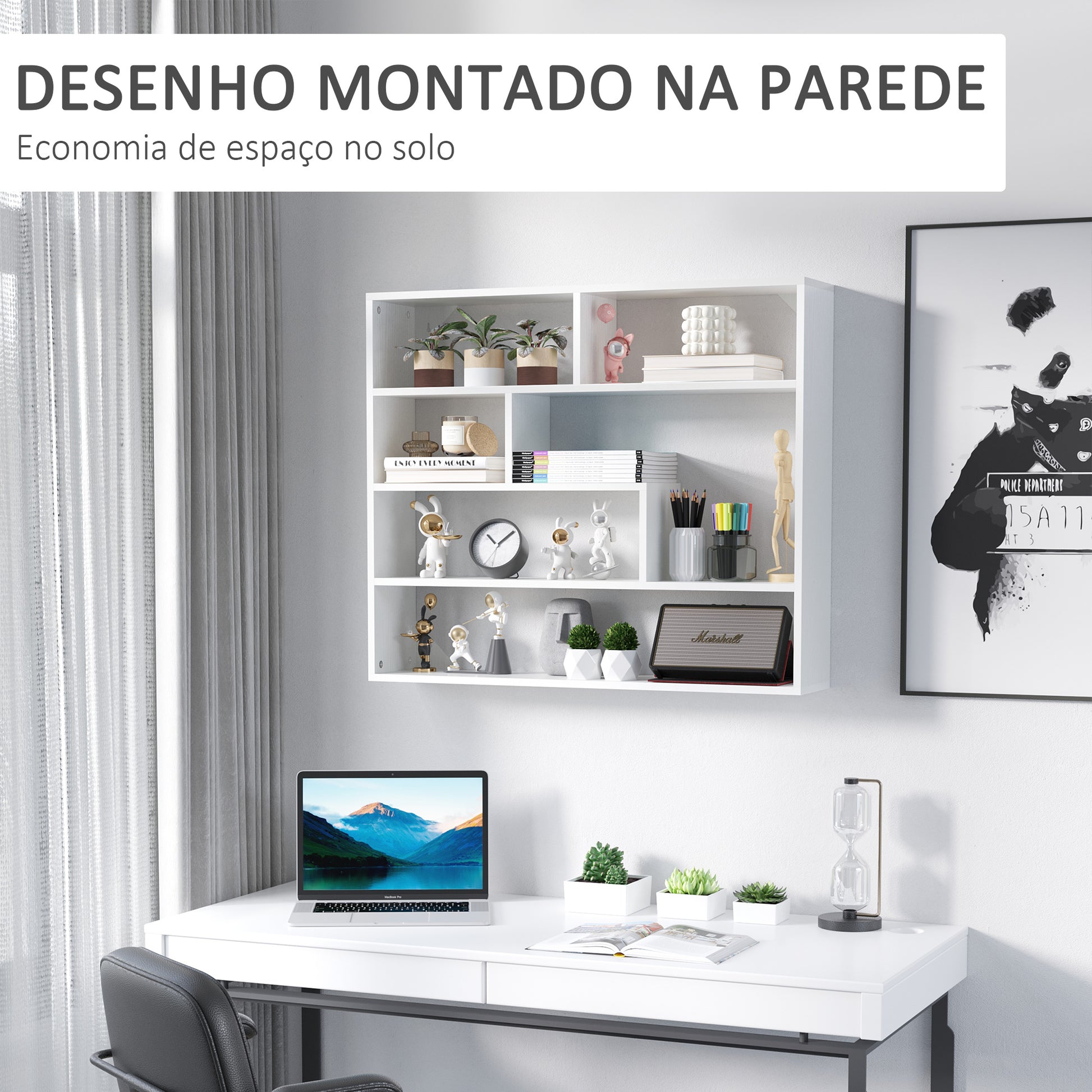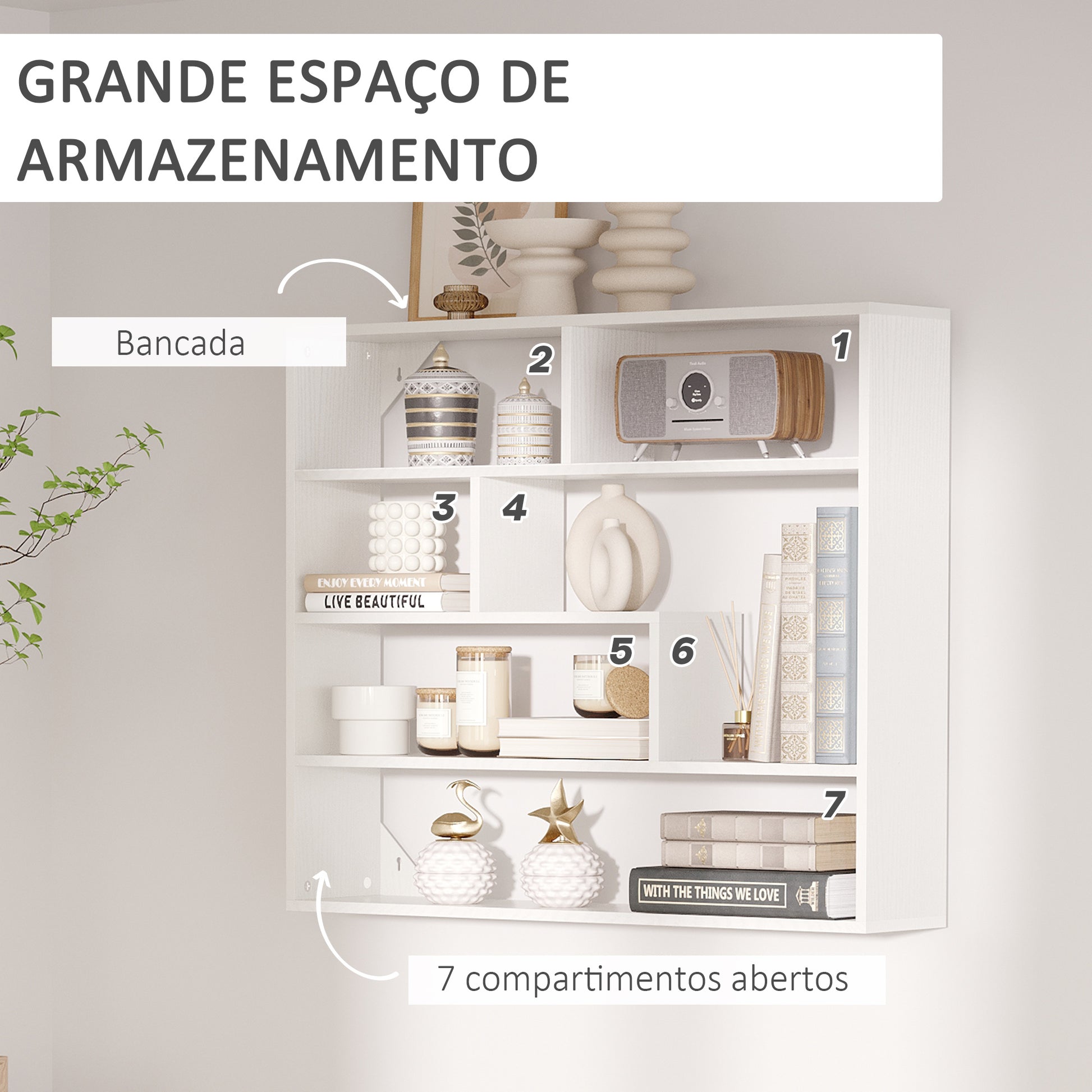 - Benefícios: Desenho moderno com 7 compartimentos abertos para exibir livros, fotos, decorações e mais