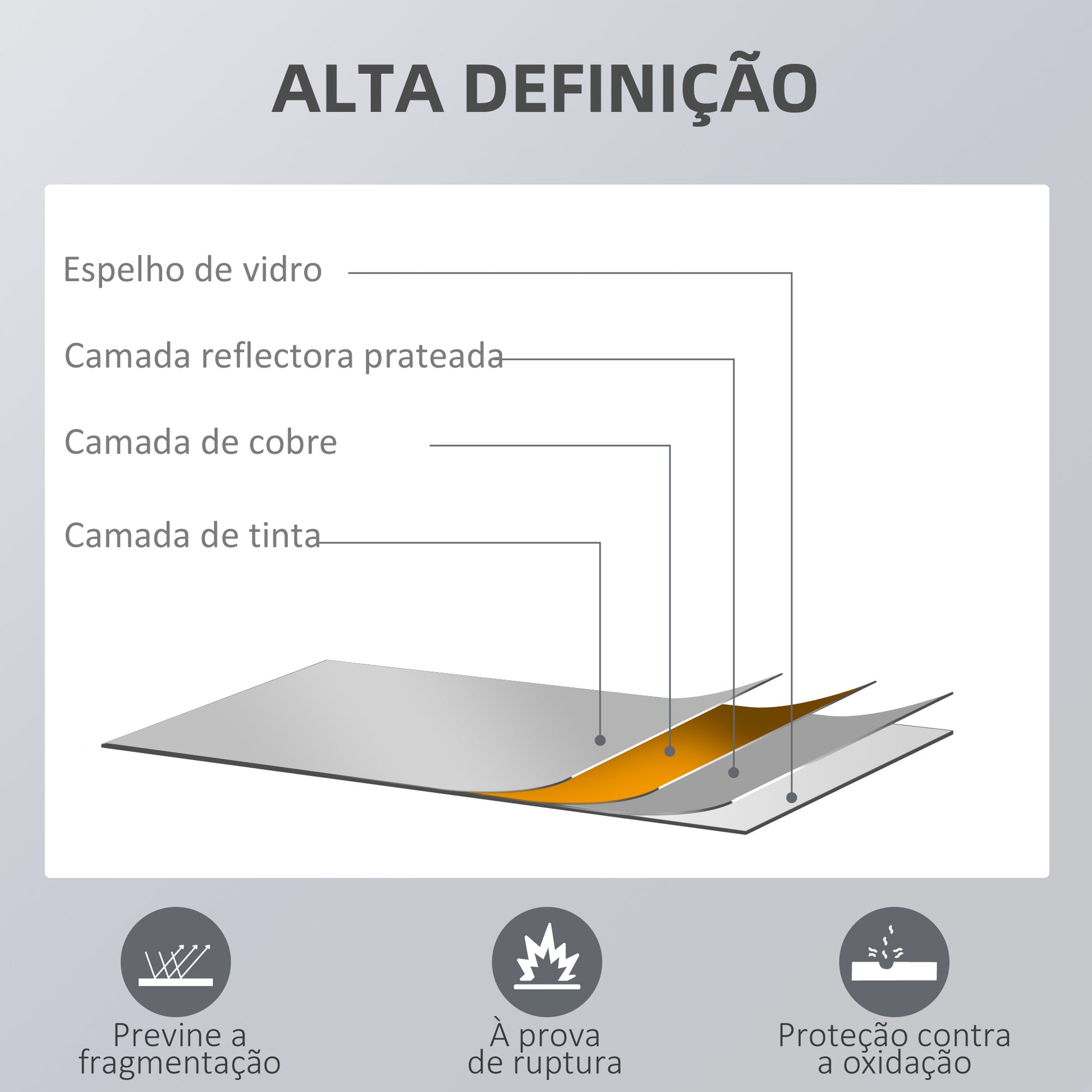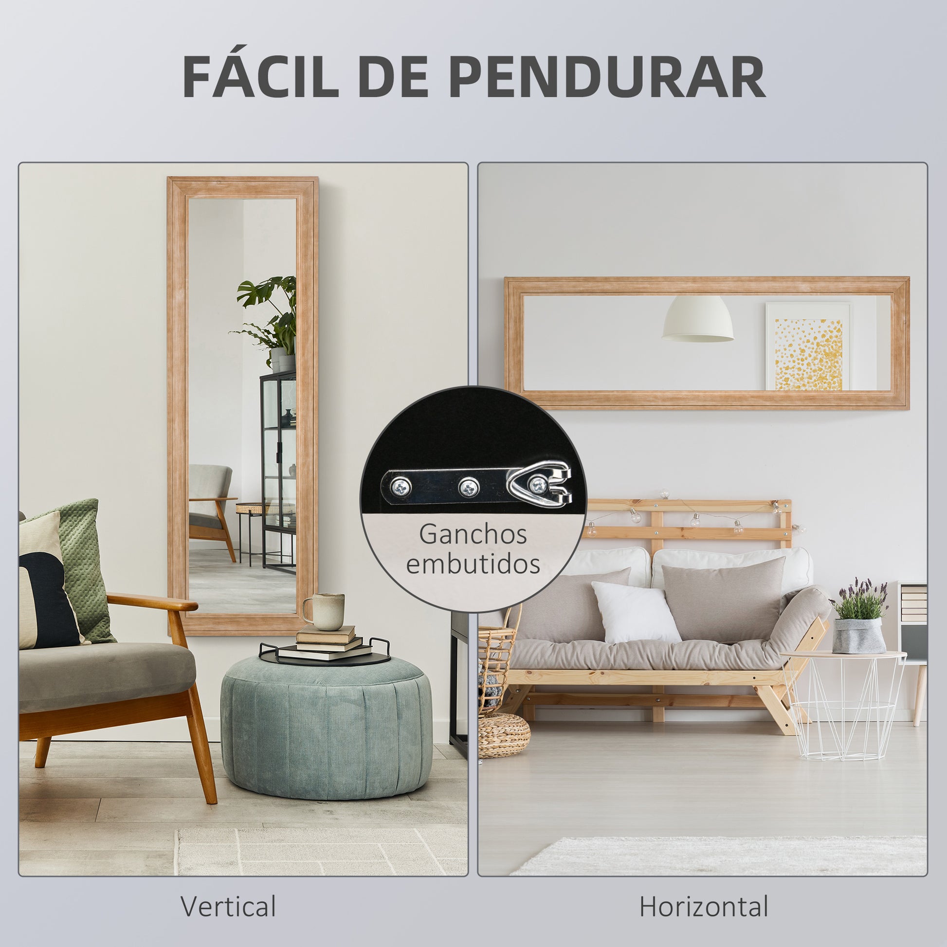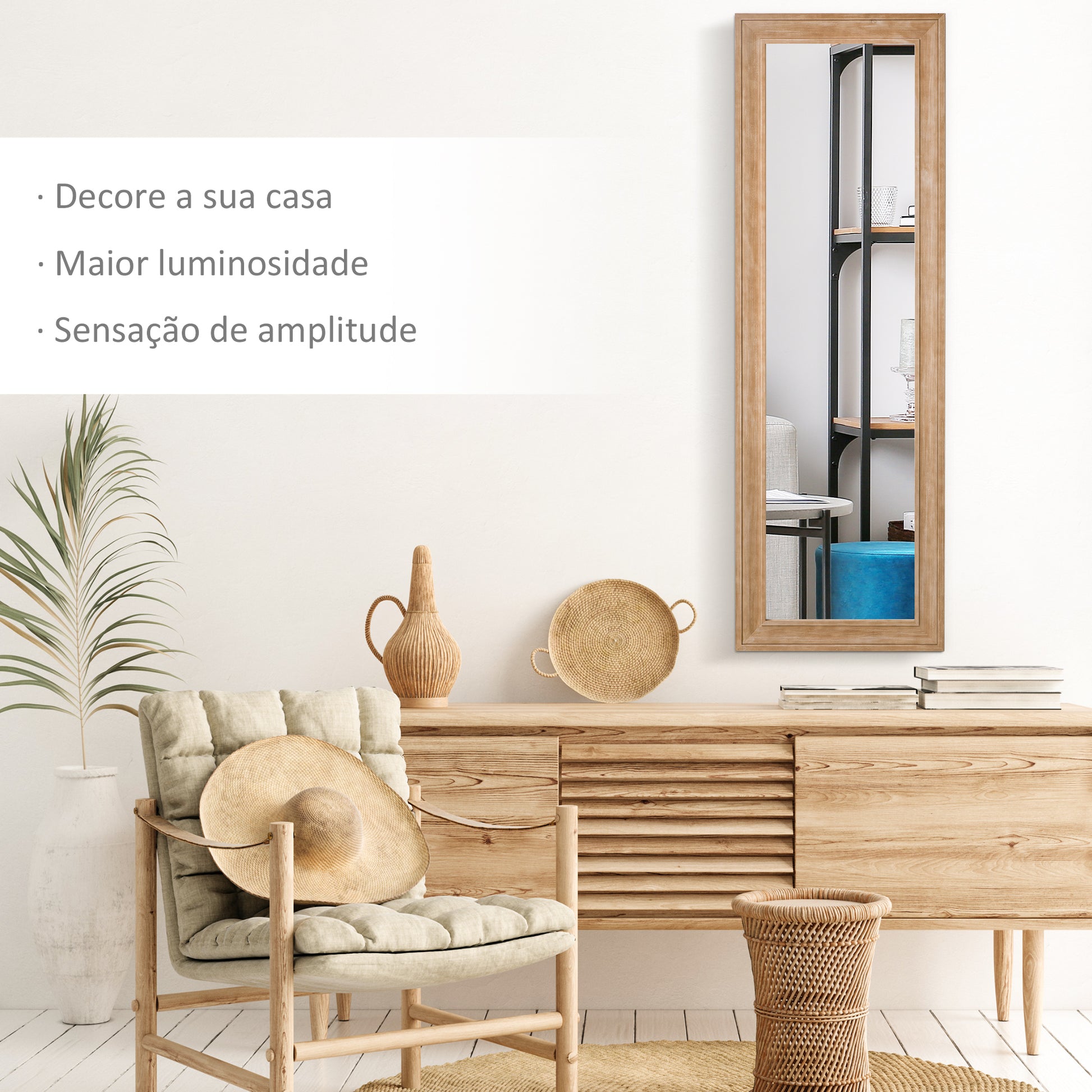 - Benefícios: O vidro com revestimento em prata proporciona um reflexo claro. A estrutura resistente em madeira de pinho com pintura à base de água garante durabilidade.