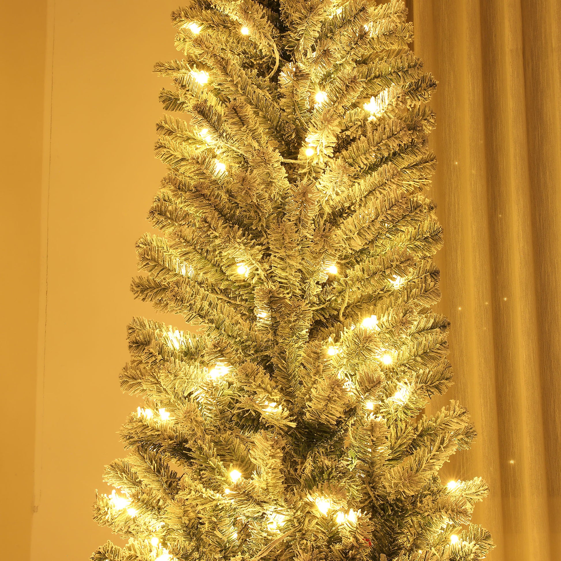 Ilumine o seu Natal com esta árvore artificial elegante, equipada com controle remoto para ajustar as luzes e criar o ambiente festivo ideal. Com um design estreito e 519 ramos com efeito nevado, esta árvore é perfeita para espaços pequenos ou como uma segunda árvore no seu hall de entrada.