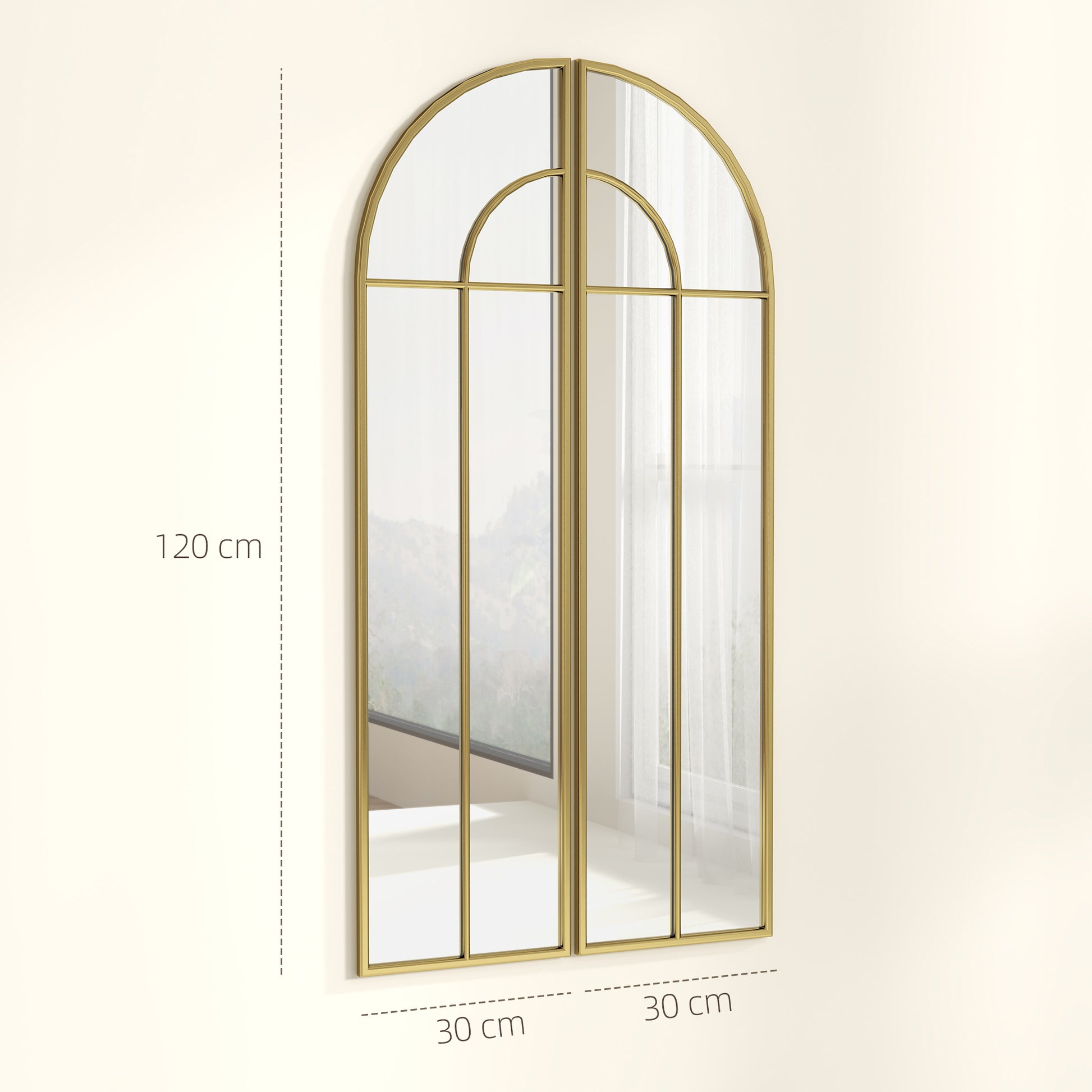 Adicione um toque de sofisticação à sua casa com este espelho decorativo de parede em forma de arco e estrutura de metal, na cor ouro. Com medidas totais de 30x3x120 cm (CxLxA), este conjunto de 2 peças é ideal para realçar a decoração de salas de estar, dormitórios e entradas.
