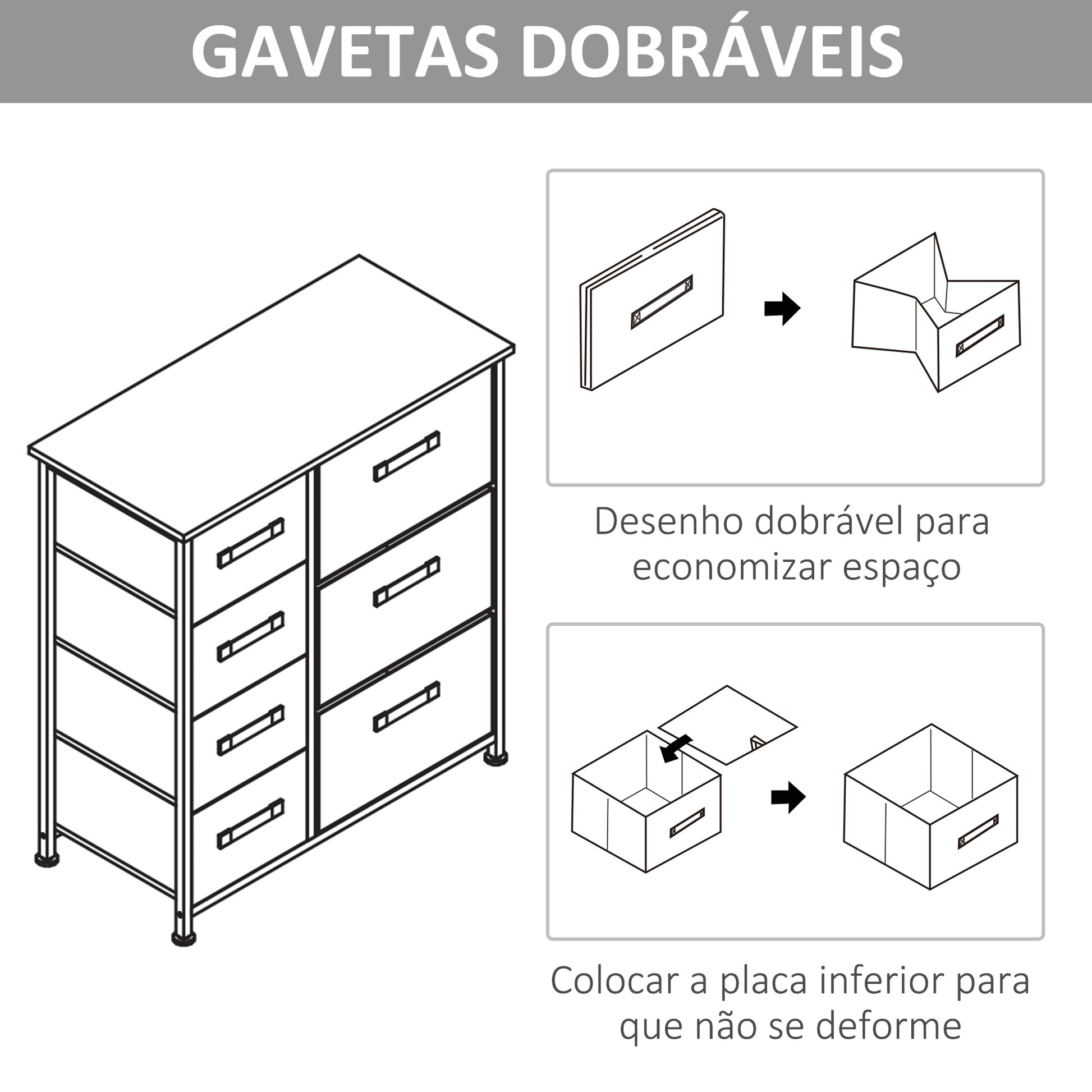 Esta moderna cómoda apresenta 7 gavetas de tecido não tecido (TNT) para uma organização eficaz de roupas e acessórios. Com estrutura metálica e tampo em MDF, é resistente e estável, oferecendo versatilidade para ser utilizada em diferentes ambientes.