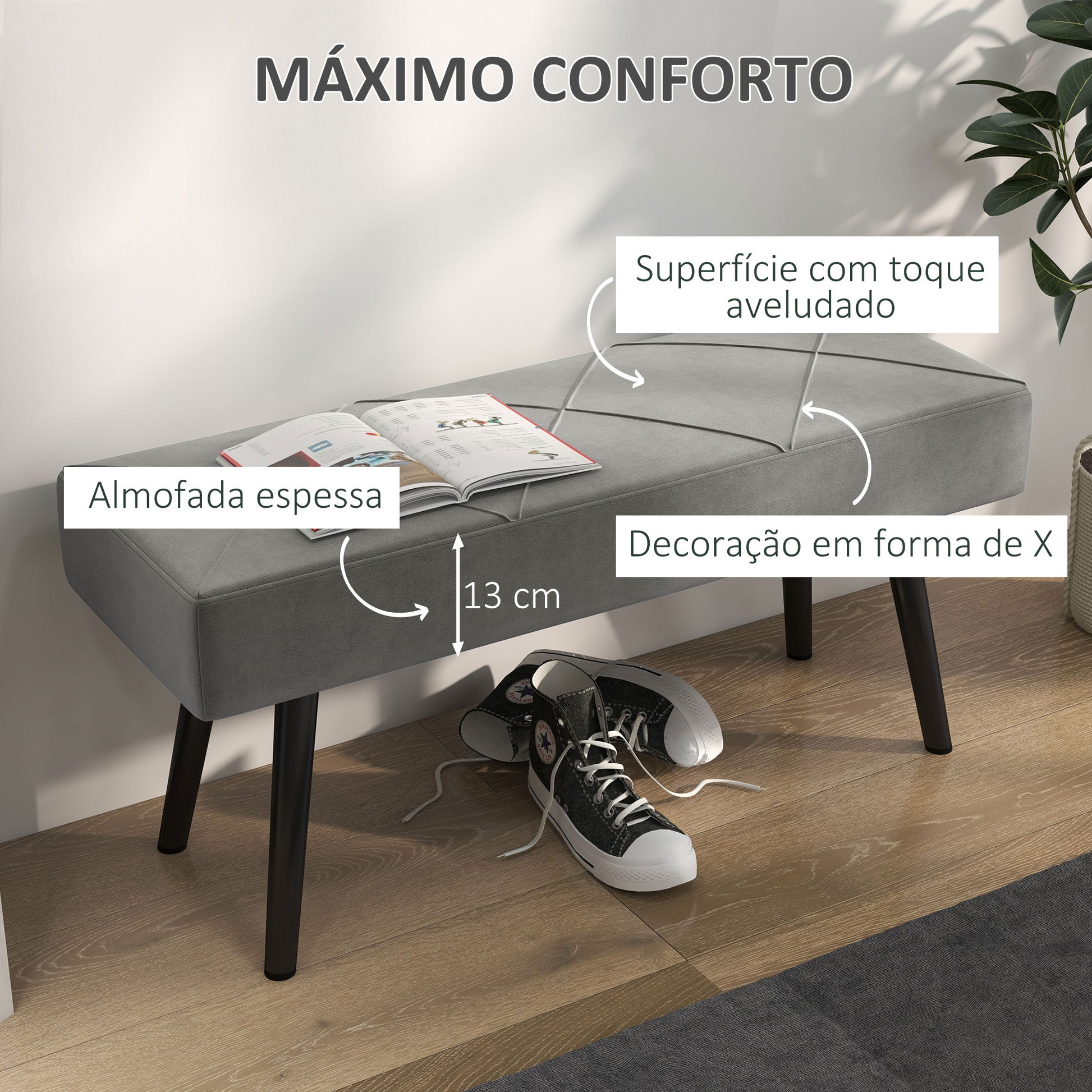 - Usos recomendados: Ideal como banco de pé de cama, entrada ou sala de estar.