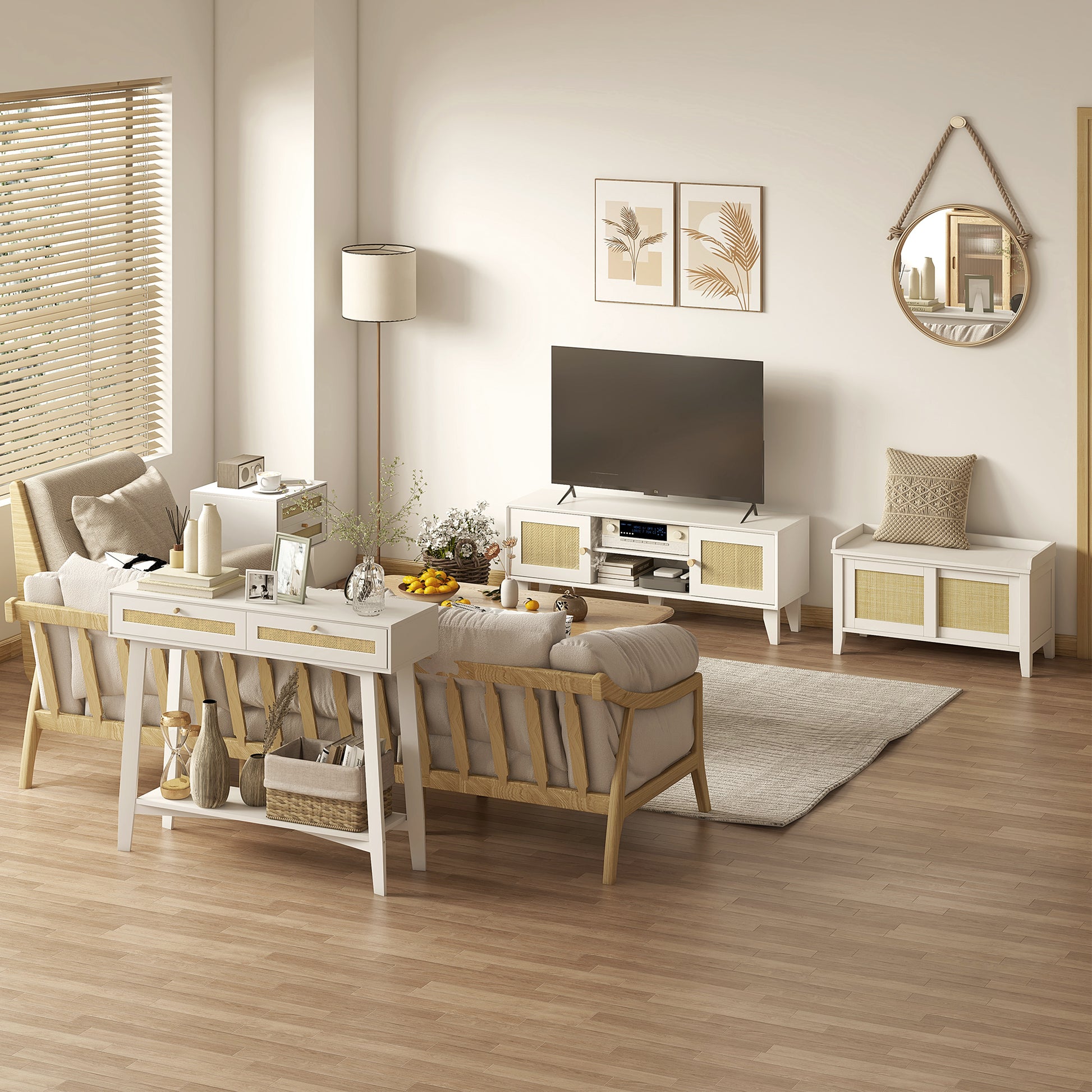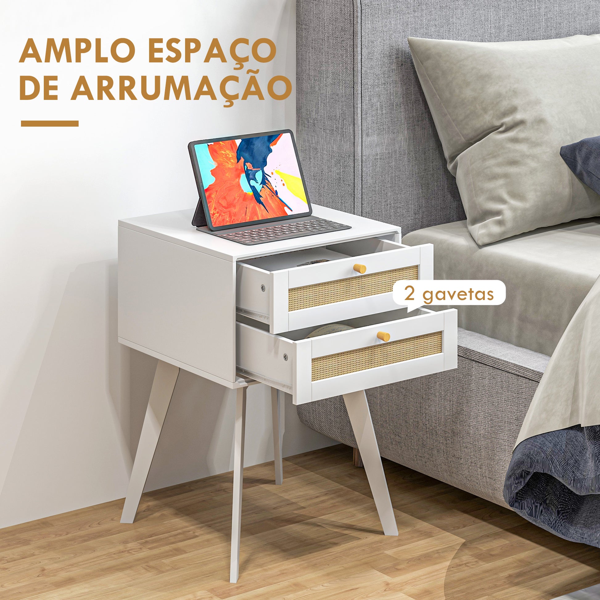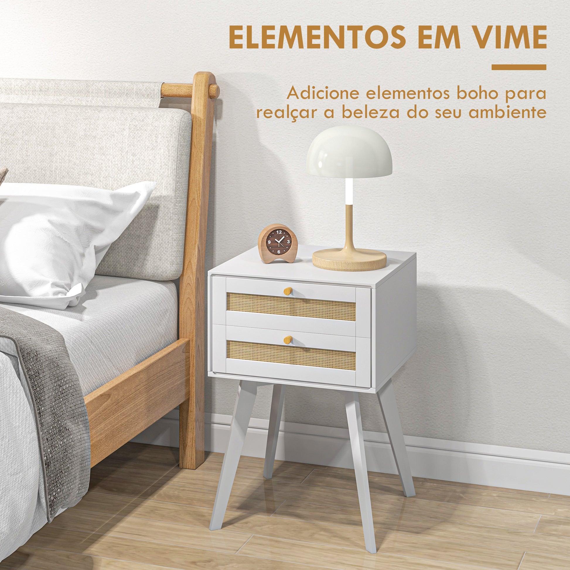 Esta mesa de cabeceira branca estilo boho é o complemento perfeito para o seu quarto ou sala de estar. Com duas gavetas de vime, oferece ampla capacidade de armazenamento e um toque de elegância à decoração.