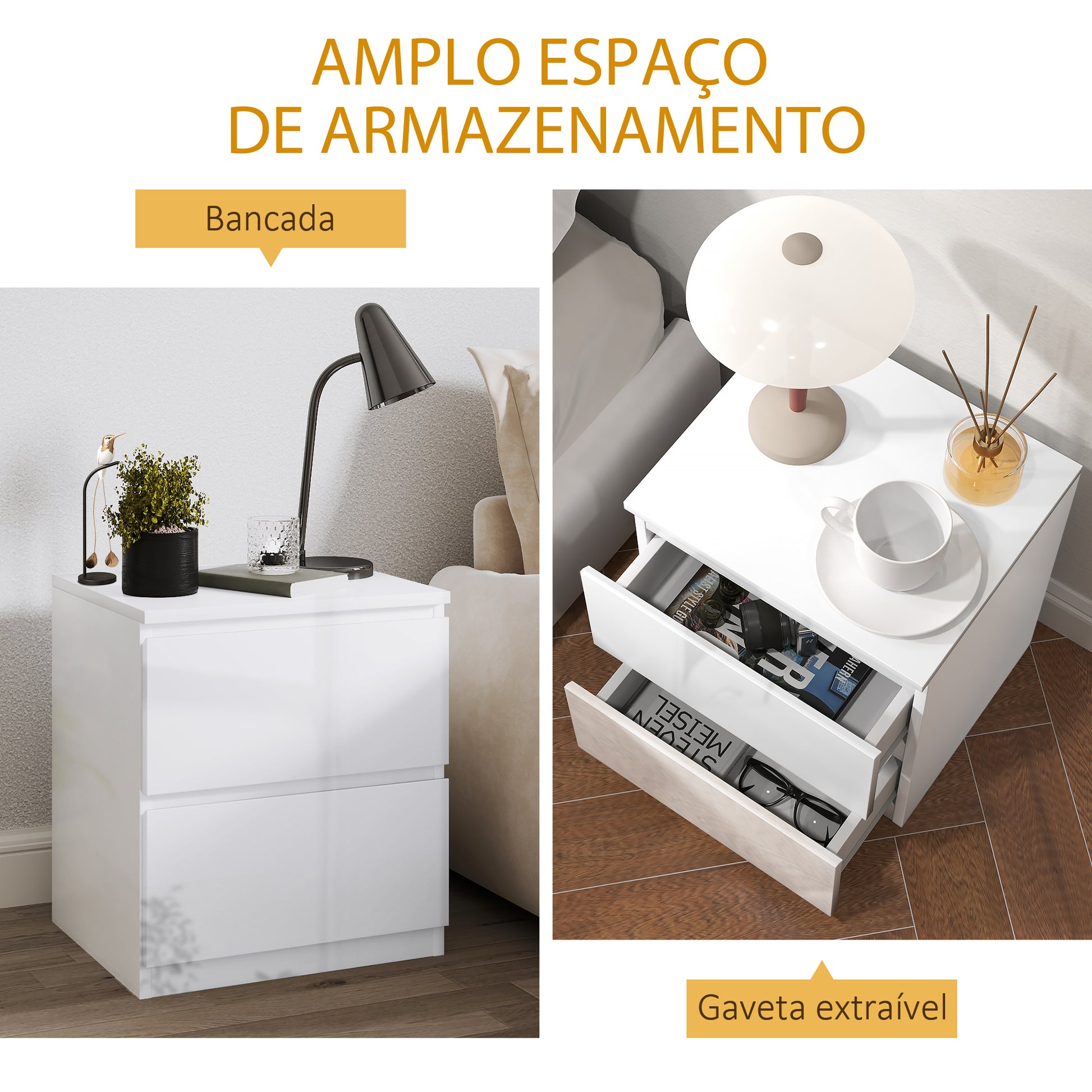 Adicione um toque de elegância e modernidade ao seu quarto com esta mesa de cabeceira moderna e funcional, em branco de alto brilho e medidas de 40x34x45 cm.