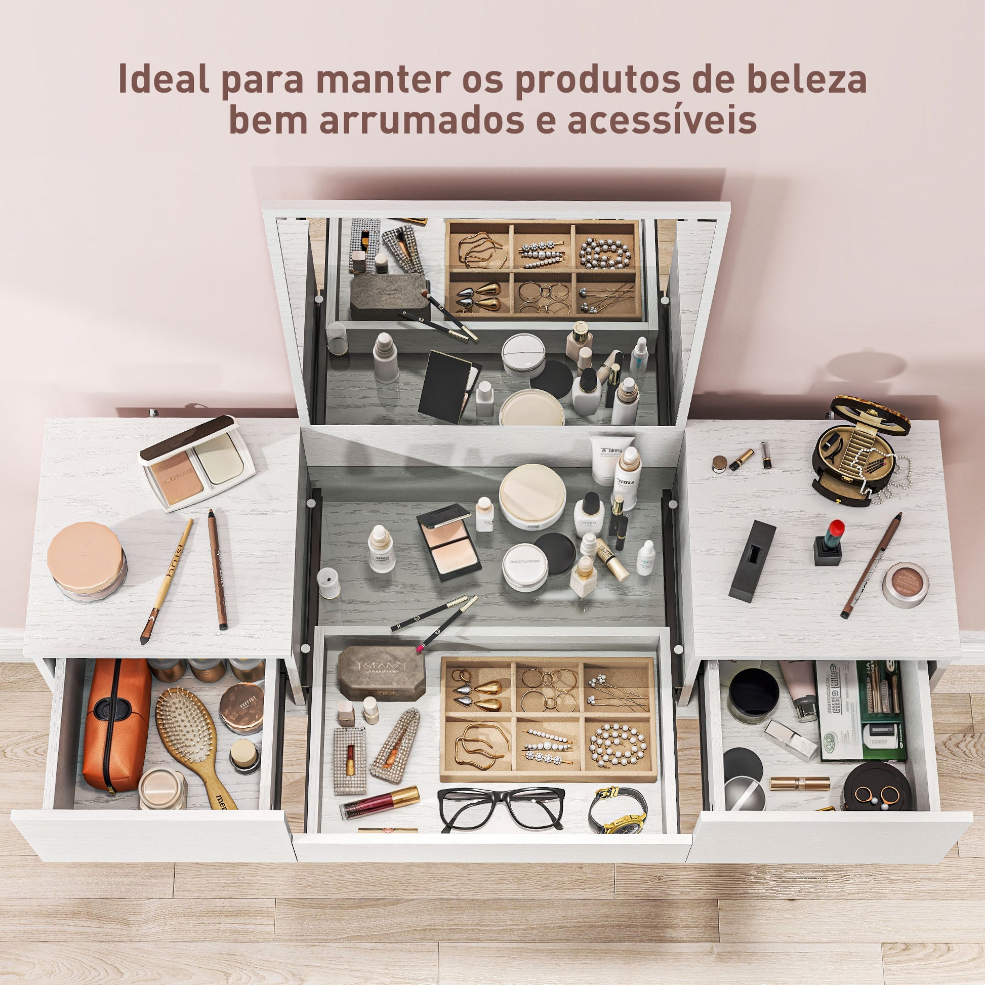 - Benefícios: Superfície de vidro temperado, três gavetas espaçosas, espelho quadrado de 43x43 cm, pés metálicos com almofadas ajustáveis, sistema anti-tombo